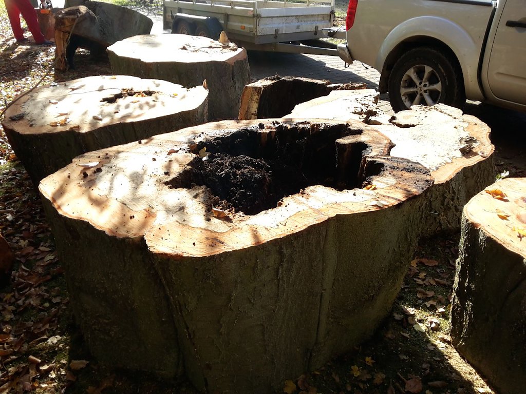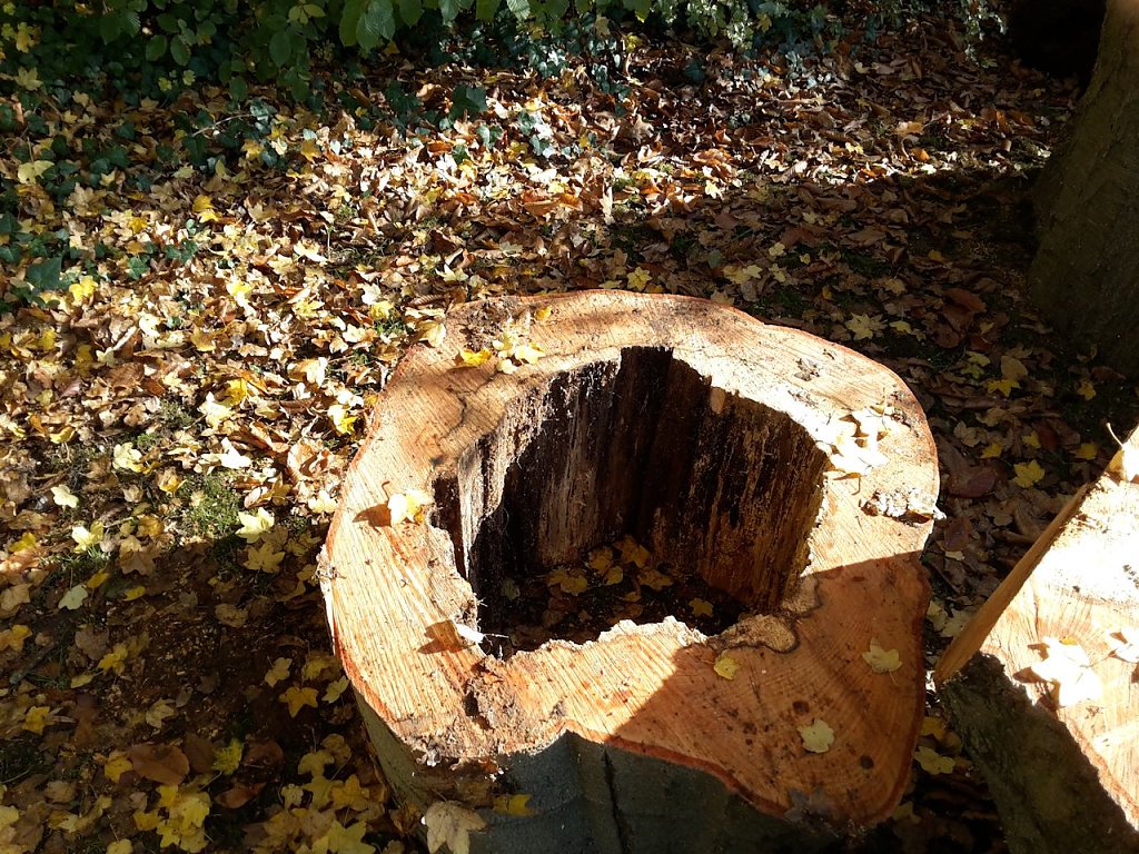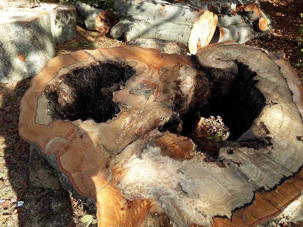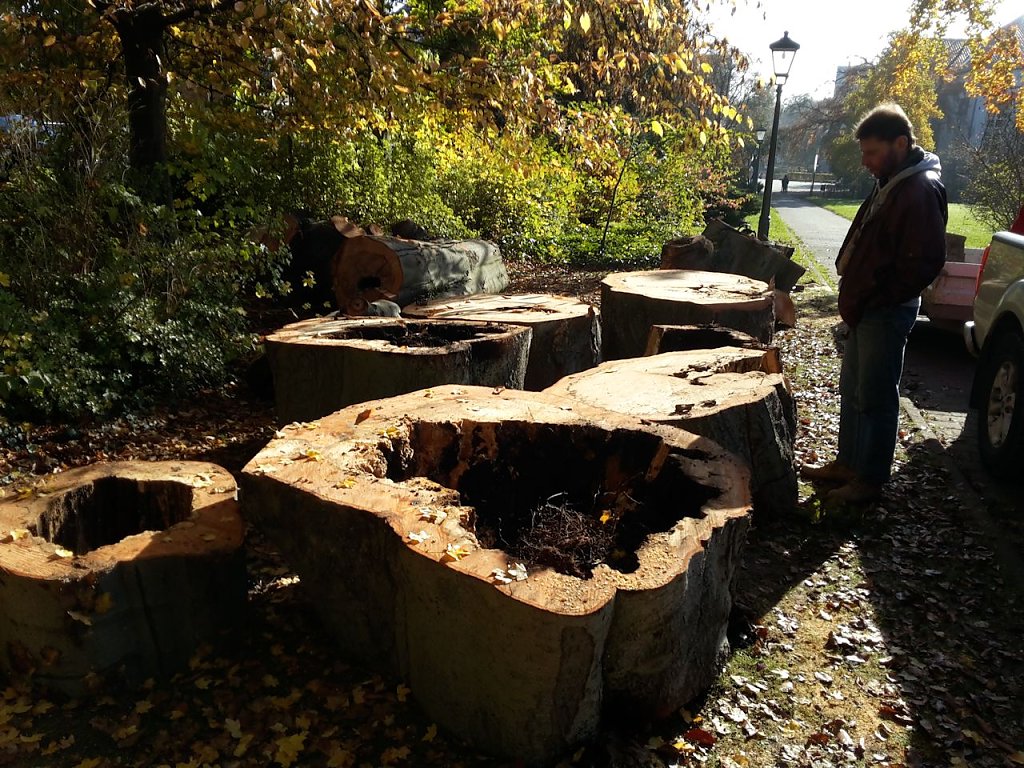 Ganz uneigennützig ist natürlich die ganze Sache nicht. Wie wir wissen ist Buche ein sehr gutes Brennholz. Einige gute Stücke zum Verbrennen werden schon abfallen. Alles im allem, die Stadt spart Geld und der gute Mann hat Brennholz. In den nächsten Tagen wird noch die Wurzel entfernt und eine neue Buche gepflanzt.