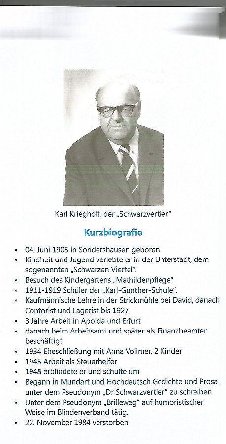 Unter seinem Pseudonym D’r Schwarzvertler ist er in die Kulturgeschichte seiner Heimatstadt Sondershausen eingegangen: der Mundartdichter Karl Krieghoff (5.6.1905 bis 22.11.1984).