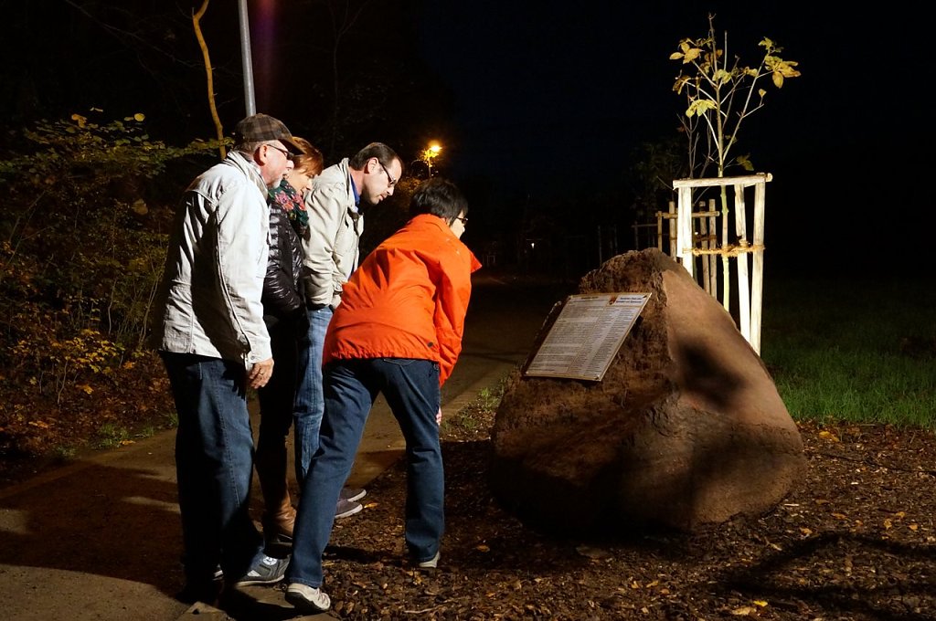 Auf einem Stein am Eingang der Allee am Gondelteich ist eine Erinnerungstafel angebracht, auf der die Geschichte der Kastanienallee und die Namen aller Spender bis zum heutigen Tag zu lesen sind.