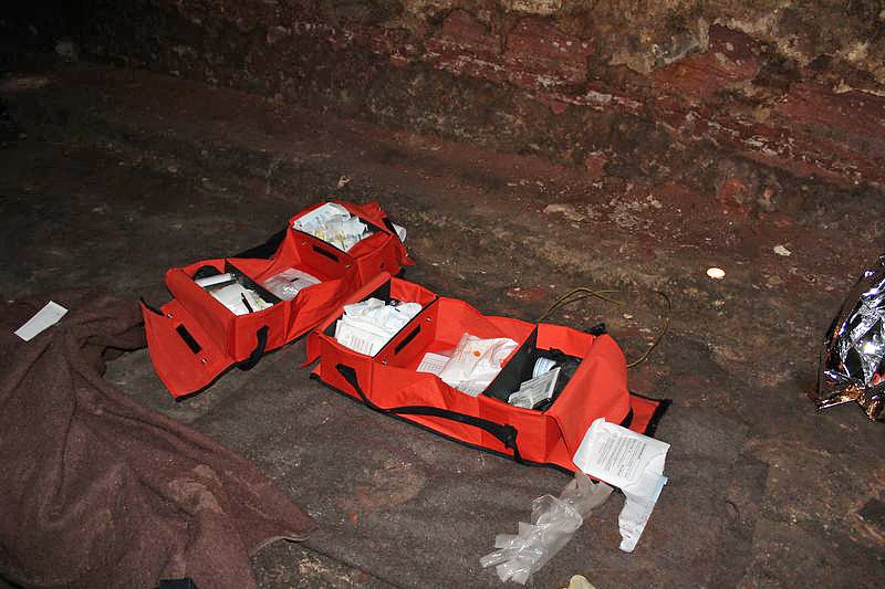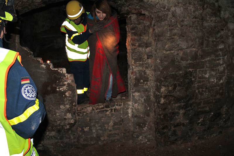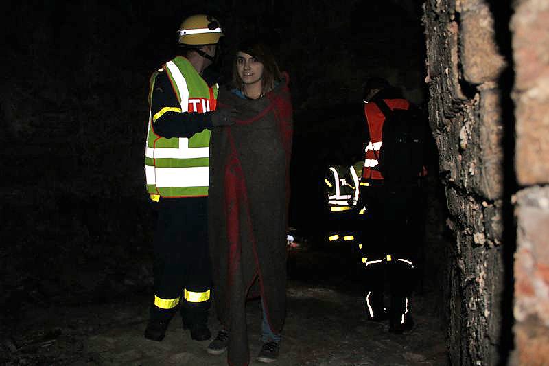 Gute schauspielerischen Leistungen muss man auch den Kameradinnen und Kameraden des DRK bescheinigen, die auch eine zeit lang im Dunkeln ausharren mussten, ehe sie gerettet wurden. Einige Eindrücke hat kn in der Bildergalerie dargestellt und auch mal den Blitz weggelassen, um zu zeigen, dass die Orientierung nicht leicht war und deshalb auch viel Technik in den Berg getragen werden musste.