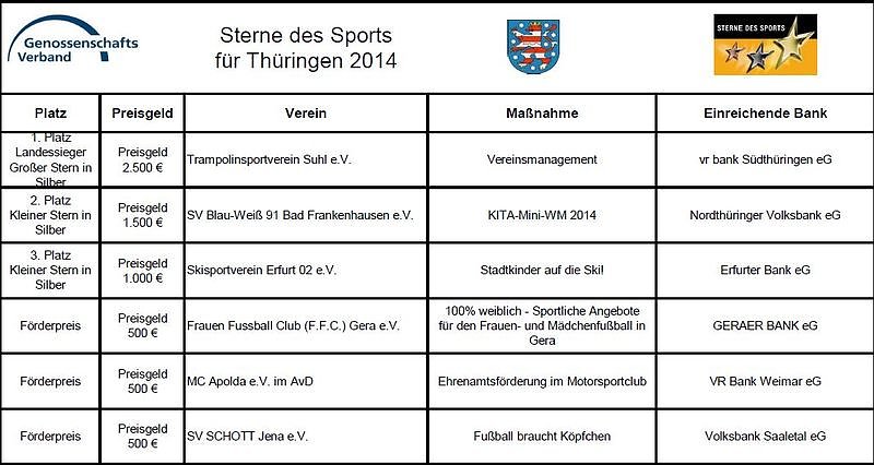 Insgesamt bewarben sich in Thüringen 164 Vereine bzw. Projekte für die Sterne des Sports. In Erfurt waren nun 6 Projekte ausgewählt, die eine Chance auf den Erhalt des Großen Sternes in Silber hatten. Lohn für den Sieg auf Landesebene war die Qualifikation für das Bundesfinale am 28.01.2015 in Berlin und die Chance auf den Großen Stern in Gold, welcher vom Bundespräsidenten persönlich verliehen wird.