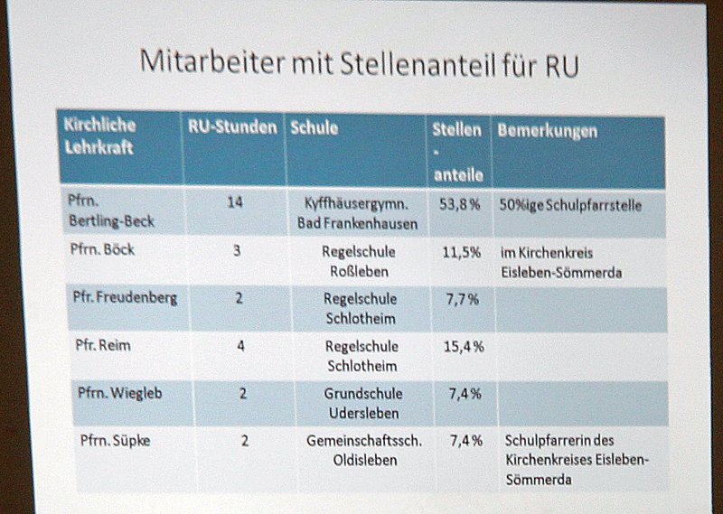 Schulpfarrerin Frau Bertling-Beck hatte die Kreissynode über die Arbeit am Kyffhäusergymnasium Bad Frankenhausen informiert. Im RU seien alle Religionen angesprochen worden bis hin zu einem Fall einer Indianerreligion. Wichtig sei es, beim RU alle fremden Religionen zu würdigen. Auf die Möglichkeit des RU weist sie immer am Tag der offenen Tür im Kyffhäusergymnasium hin, was gut funktioniere.