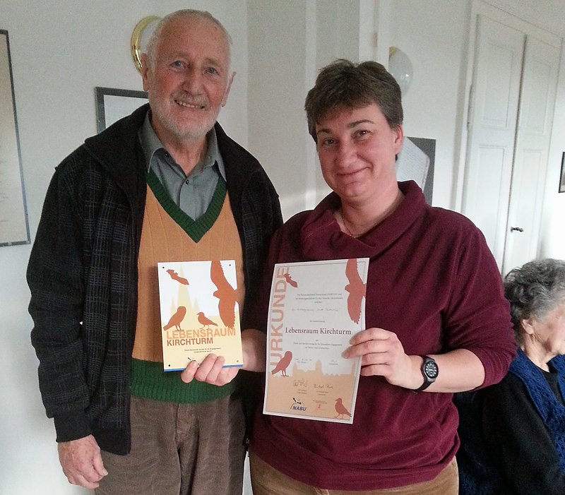 So übernahm Pastorin Frau Wiegleb und Herr Rudolf Scheibner die Ehrung am 09.12.2014 in Bendeleben. Herr Scheibner zählte die letzten Jahre in 2 Kästen für Schleiereulen 14 junge Vögel.