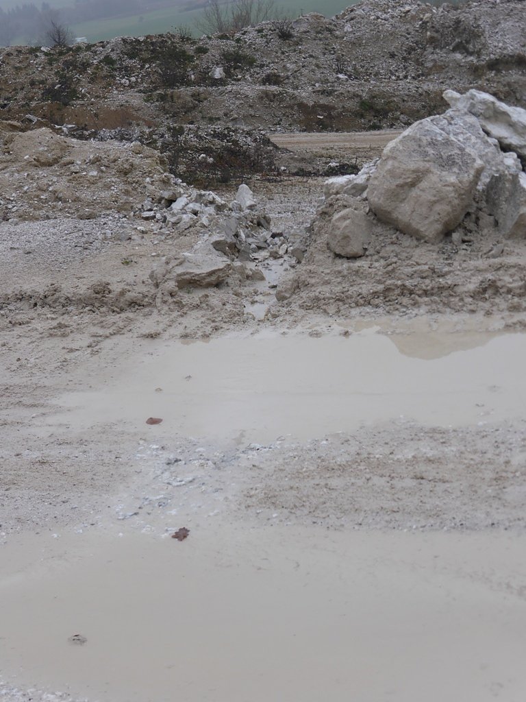 "Ob und wie welche Behörde auf diese Anzeige reagiert hat (beispielsweise mit einer Begehung) ist mir nicht bekannt. Ich lade alle Beteiligten hiermit zu öffentlichen Stellungnahmen ein. Die auf den Fotos abgebildeten Bohrungen befinden sich auf einer oberen Abbaustrosse. Diese laut dem Informanten auch bewusst so niedergebracht, als wolle man das Schichtenwasser bzw. dessen Verlauf im Berg, das (obwohl es zum Zeit der Aufnahme ca. 14 Tage nicht geregnet hatte) als kleine Quelle unterhalb der Bohrungen hervortritt, sehr wohl erkunden.