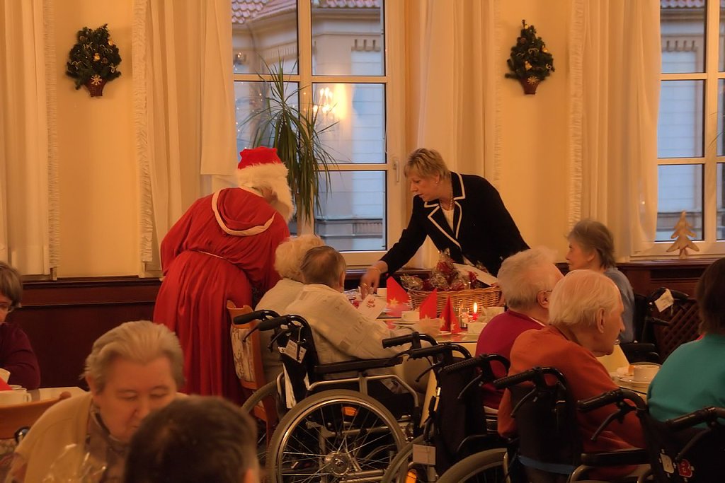 Natürlich kam auch der Weihnachtsmann, der mit Frau Röder Geschenke verteilte. Das waren meist Gutscheine für Friseur, Fußpflege oder Kosmetikartikel.