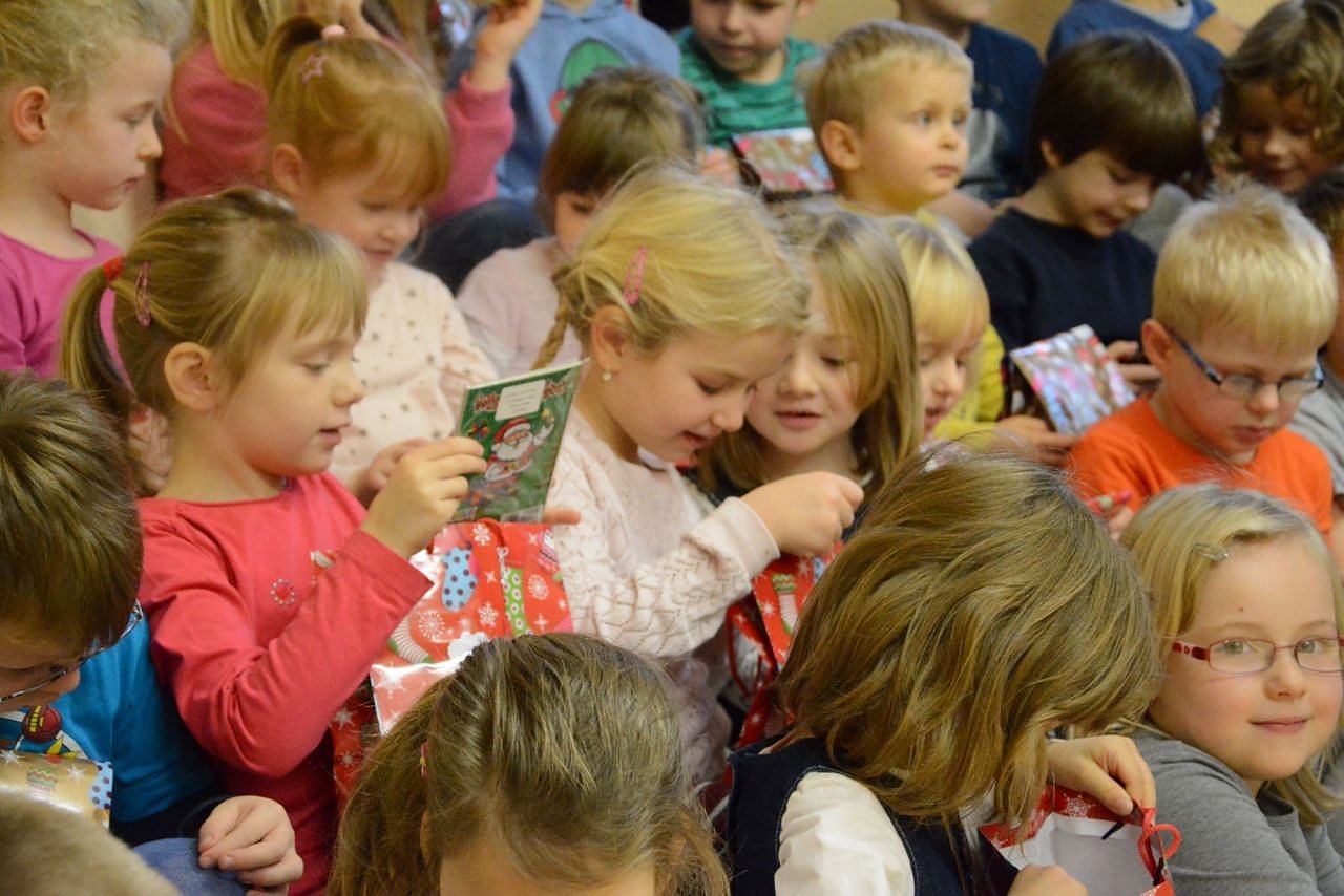 Zwei mit bunten Beuteln gefüllte Kisten gerieten schnell ins Blickfeld der zahlreichen Augenpaare. Gespannt warteten die Kinder auf die vorweihnachtliche Bescherung. Die Erzieher teilten die Tüten, die mit Kleinigkeiten zum Naschen, zum Spielen und zum Malen gefüllt waren, an die Mädchen und Jungen aus. Groß war die Freude bei den zweieinhalb- bis sechsjährigen Kindern über den liebevoll zusammengestellten Inhalt.