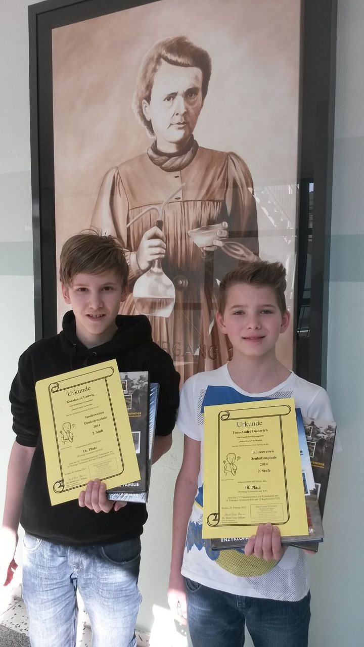 Erneut große Denker am Staatlichen Gymnasium Marie Curie in Worbis - Allgemeinwissen, Spezialkenntnisse in Englisch und Deutsch, aber auch auf naturwissenschaftlich-mathematischem Gebiet überdurchschnittlich gut, dies waren die Voraussetzungen für das sehr gute Abschneiden von Konstantin Ladwig (Kl. 6.2) und Tore-André Diederich (Kl. 6.4) bei der zweiten Stufe der diesjährigen Denkolympiade.