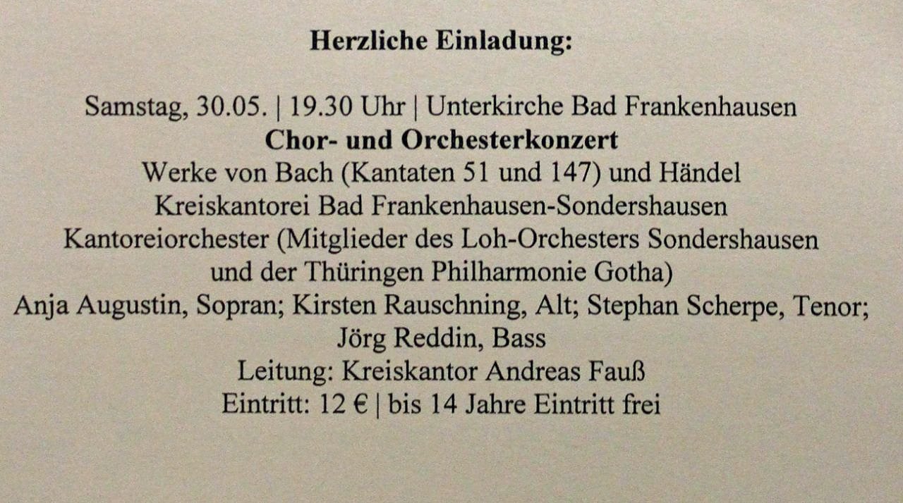 Die Gesamtleitung lag bei Kreiskantor Andreas Fauß, der den Ökumenischen Chor dirigierte und der auch an der Orgel zu hören war. Organisiert wurde das Konzert von der evangelischen Kirchgemeinde Sondershausen.