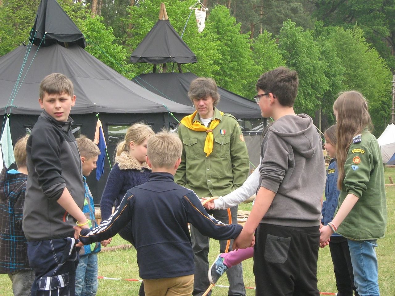Das Geländespiel stand ganz im Zeichen der Tiere auf dem Weg zur Arche Noah. Um sich noch besser kennenzulernen bildeten die 30 Ortsgruppen zwölf Teams, in denen jeweils eine Tiergattung verankert war – wir waren die Mäuse. An 24 Stationen gab es kooperative Spiele die anspruchsvoll, aber auch lustig waren. Das Geländespiel führte rund um das Zeltlager und durch den Friedensauer Forst. Am Abend gab es dann in der Arena die "Heufütterung" der Tiere – das Gemeinschaftsessen aller Gruppen in Form eines Riesen-Potluck.