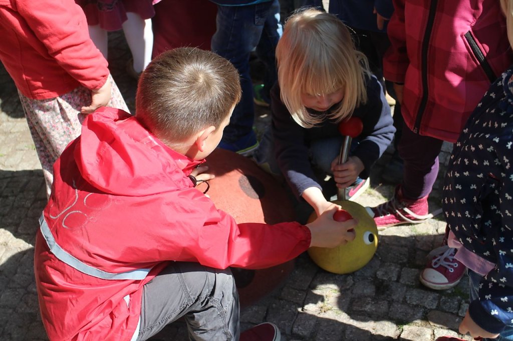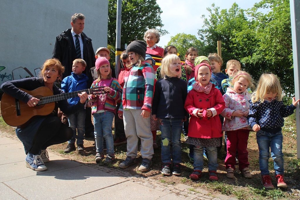 Bevor jedoch das schwarz-gelbe Bändchen durchgeschnitten werden konnte, durften die Kinder erst einmal noch ein Ständchen singen und ein eigens erdachtes Gedicht vortragen. Es sei wieder ein sehr schöner Termin, sagte Oberbürgermeister Zeh, denn man wolle die Stadt auch für die Kinder mitgestalten.
