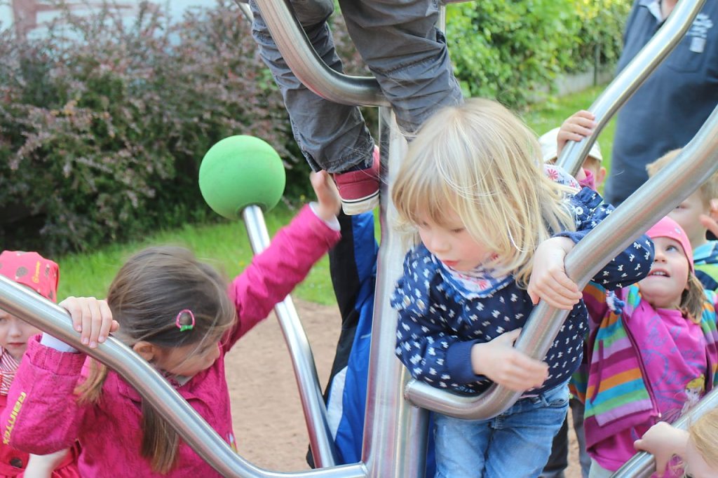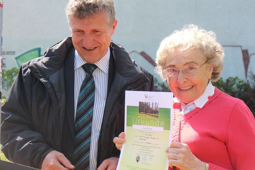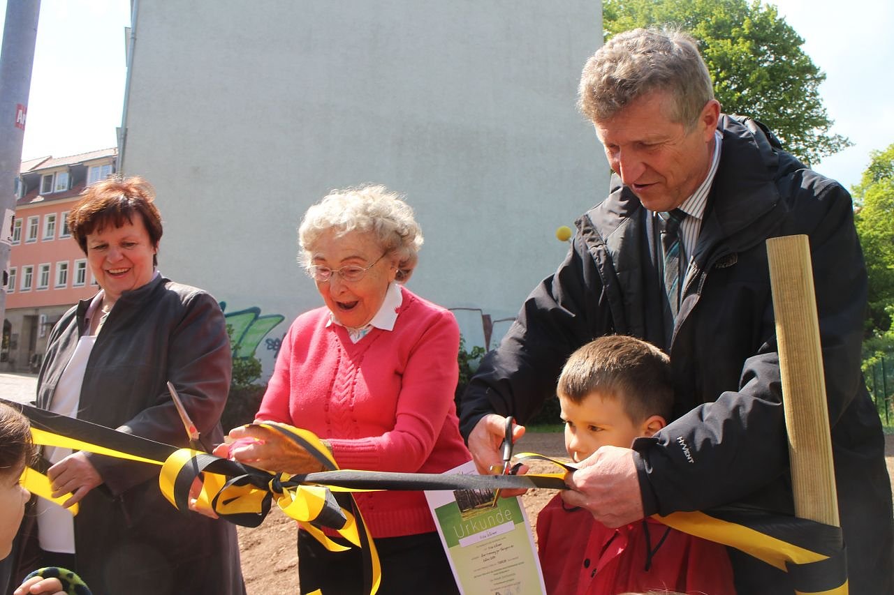 Die Prämie, die sie mitsamt der Ehrung erhielt, spendete sie dem Stadtgründfonds. Der nutzte das Geld, um in Zusammenarbeit mit der Städtischen Wohnungsbaugesellschaft das Klettergerüst aufzustellen.