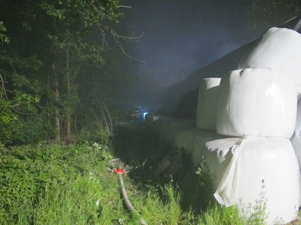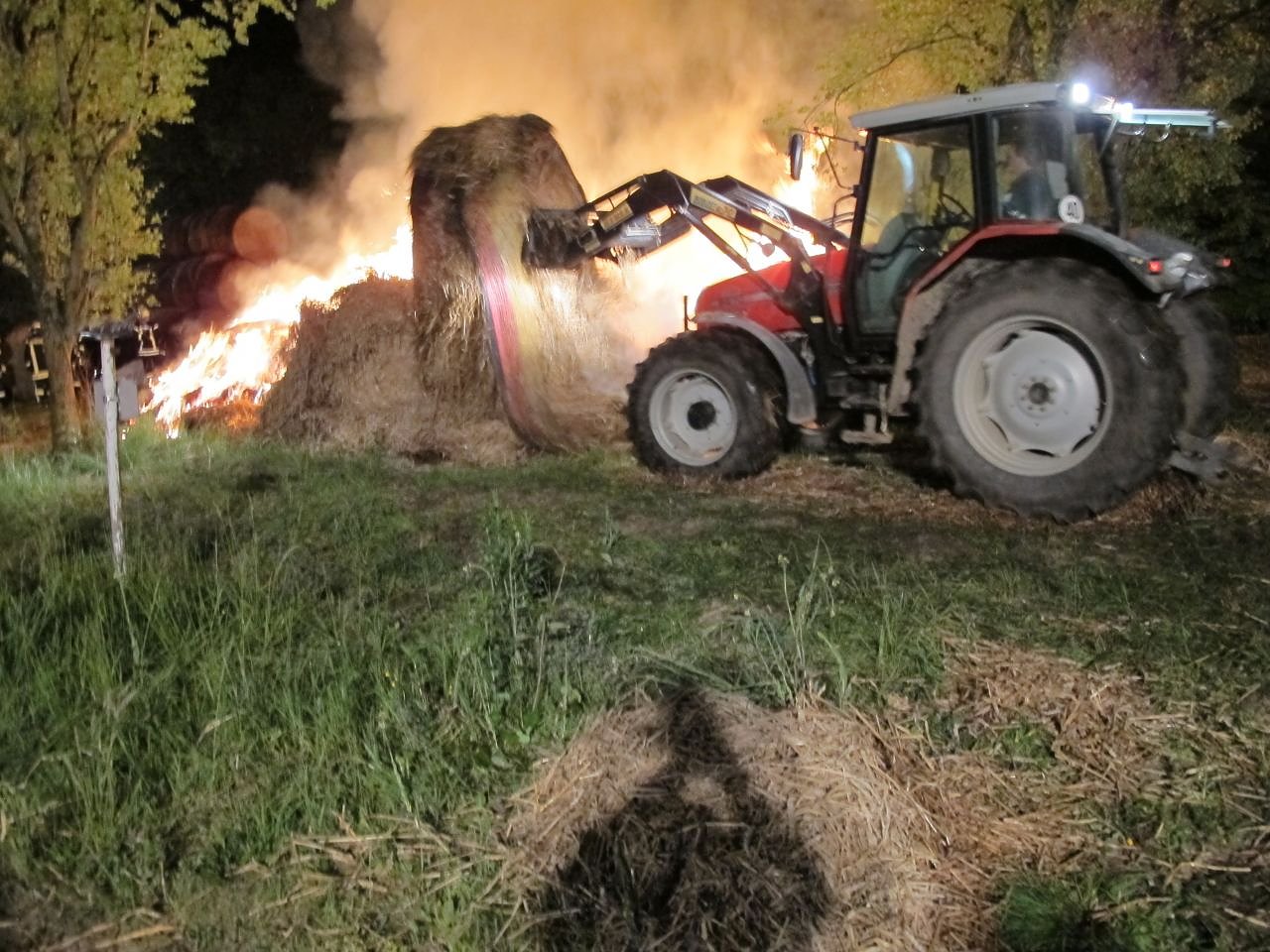 Mit Hilfe von zwei Traktoren mit Frontgabel konnte als Brandschneise eine Lücke in den etwa 120 Meter langen Stapel geschaffen werden. Anschließend wurden nicht betroffenen Ballen aus dem Brandbereich entfernt. Da das Feuer bereits in einige Balle Glutnester gebildet hatte und diese somit nicht mehr nutzbar gewesen wären, wurden am Ende die etwa 30 Ballen kontrolliert abgebrannt.