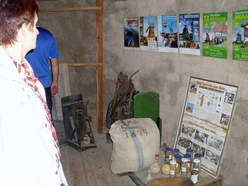 Bei der Mühle "Emma" in Immenrode schaute er der Vereinsvorsitzenden des Heimat- und Mühlenvereins Immenrode, Hannelore Kutscha, über die Schulter, wie so die alte Mühlentechnik funktionierte.