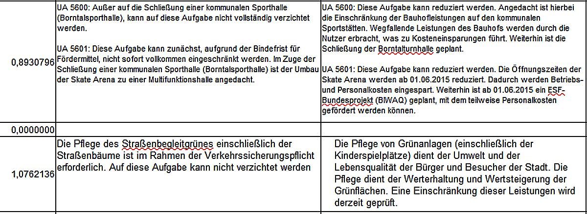 Vorgesehen ist eine Reduzierung der Unterhaltungsleistungen um 15 T€. Dies bedeutet eine Schließung von 5-6 Anlagen.