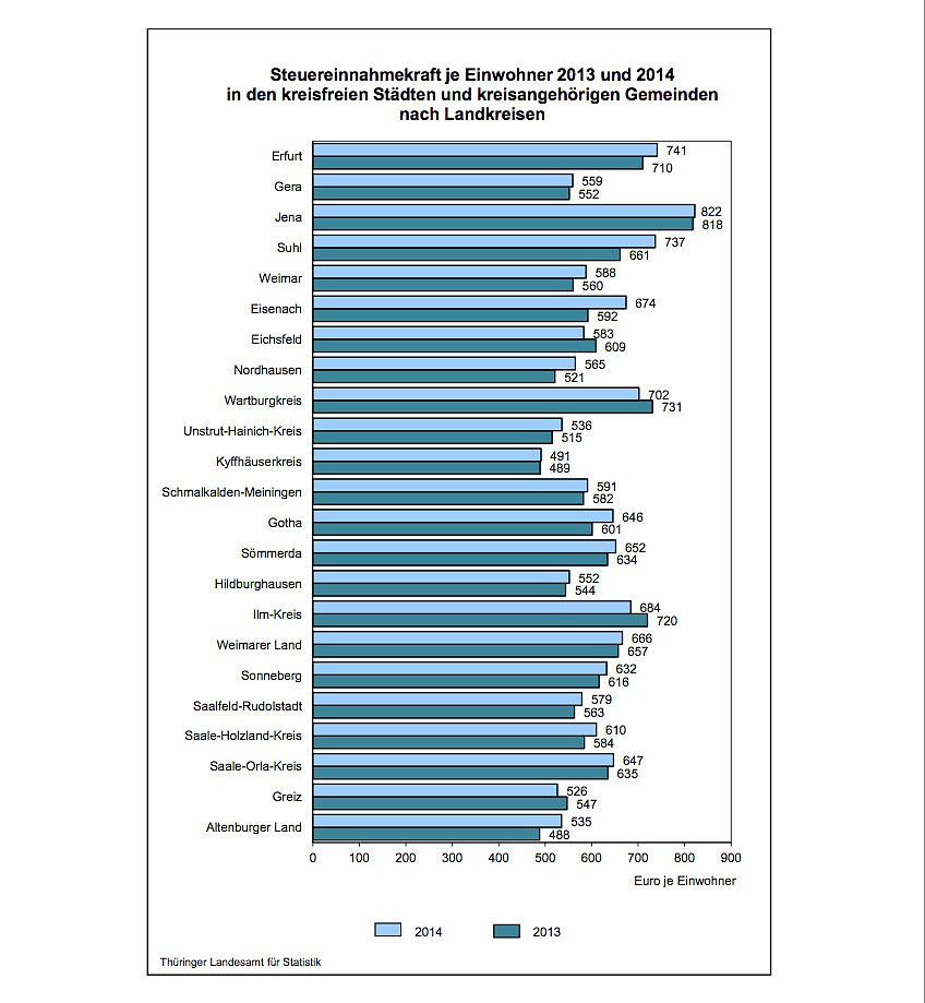 Wie in den vergangenen Jahren war die Stadt Jena unter den kreisfreien Städten mit 822 Euro pro Kopf der Bevölkerung am steuerstärksten. Steuerschwächer waren Erfurt, Suhl, Eisenach, Weimar und Gera (741 Euro, 737 Euro, 674 Euro, 588 Euro und 559 Euro). Jedoch konnten alle kreisfreien Städte eine Erhöhung ihrer Steuereinnahmekraft verzeichnen.