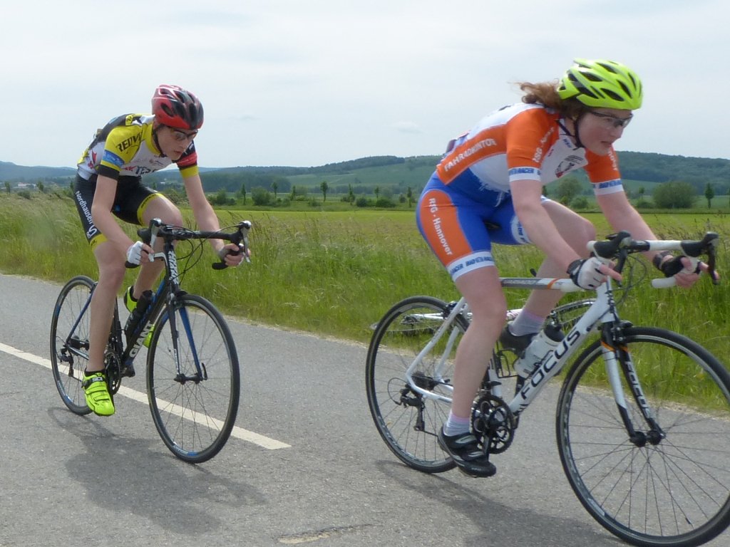 Die flache Strecke begünstigte trotz des Windes hohe Geschwindigkeiten. So konnten sich in der letzten Runde sechs Fahrer der U 17 absetzen. Unter ihnen auch Erik Wetzel, der im Zielsprint einem Fahrer aus Sömmerda und einem weiteren aus Hannover den Vortritt lassen und sich mit dem 3. Platz begnügen mussten. Niklas Aksteiner kam nicht umhin, dem hohen Tempo Tribut zu zollen und kam nach 51 km auf Platz 11.