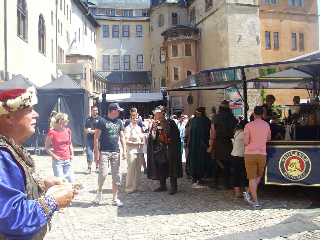 Beim Bummel die Hauptstraße hinunter verschlug es meine Frau zu einem Stand mit Handtaschen (typisch Frau) und es wurden gleich zwei Exemplare gekauft. Nur gut, dass es nebenan nicht gleich auch noch Schuhe gab?! Bis fast ans Ende der Wezelstraße hinunter gab es diverse Händler und Angebote, letztendlich blieb es aber doch nur bei den bereits gekauften Handtaschen. Dafür bewaffneten wir uns mit einem leckeren Eis und schlenderten die Burgstraße hinauf in Richtung Schloss. Im Schlosshof war auch vieles los, Leute in Kostümen, Handwerkerstände und vieles mehr.