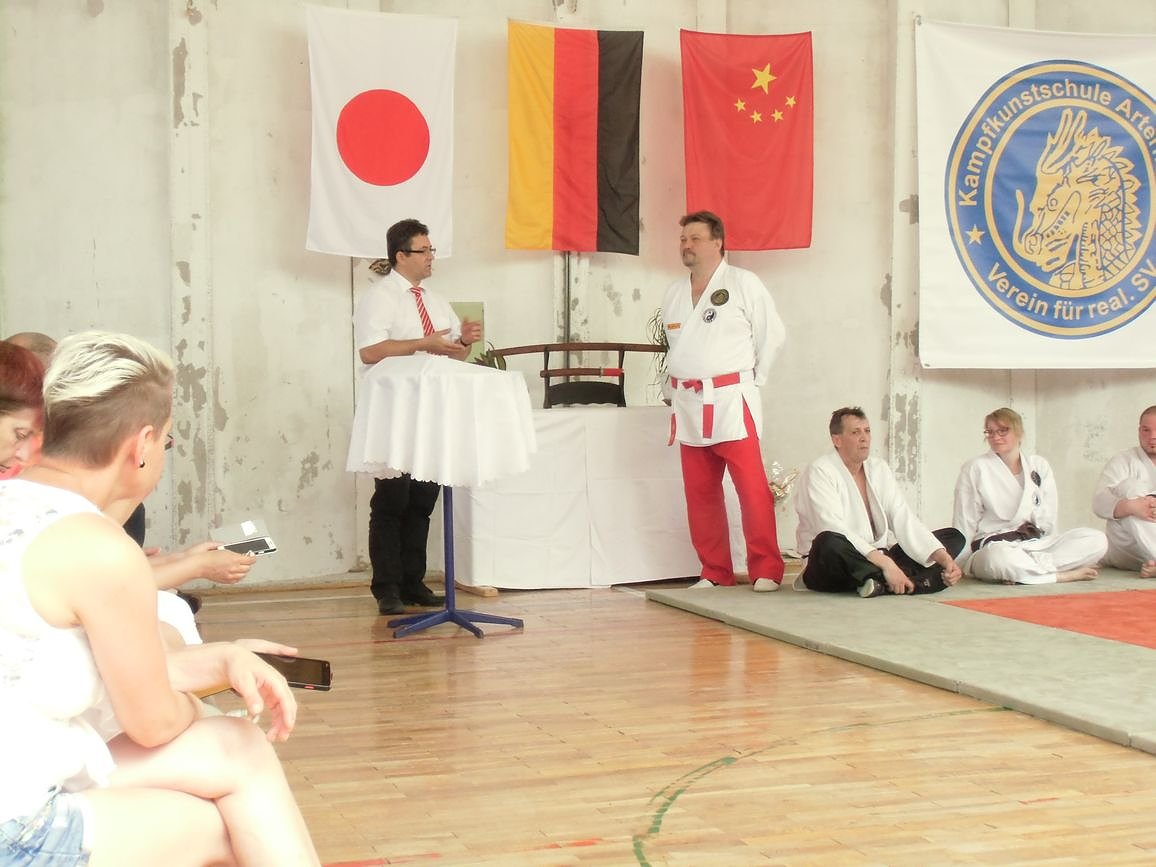 Weitere Gäste waren unter anderem, die stellvertretende Bürgermeisterin Frau Zimmer, die Vizepräsidentin des Kyffhäuser Kreissportbundes Frau Sachse, Herr Dr. Krauspe, Geschäftsführer der IBKM – Gruppe, Herr Greschuchna, Filialleiter der Kyffhäuser Sparkasse Artern. Auch gratulierten der Vizepräsident des Chinesisch – Deutschen Kampfkunstvereins / BV. e.V. Herr Thomas Köhler und der Präsident des CDk / LV. Thüringen e.V. Herr Uwe Behringer, sowie der Bundes und Landesschatzmeister des CDK BV. e. V. und CDK / LV. Thür. E. V. Herr Michael Junk.