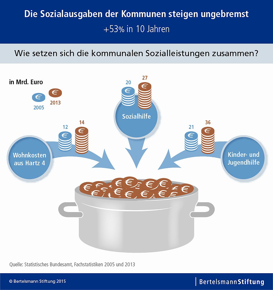 Trotz guter Konjunktur sind in den vergangenen zehn Jahren die Sozialausgaben der Kommunen um mehr als 50 Prozent gestiegen. In 2014 summierten sie sich bundesweit auf rund 78 Milliarden Euro, berechnet eine Studie der Bertelsmann Stiftung...