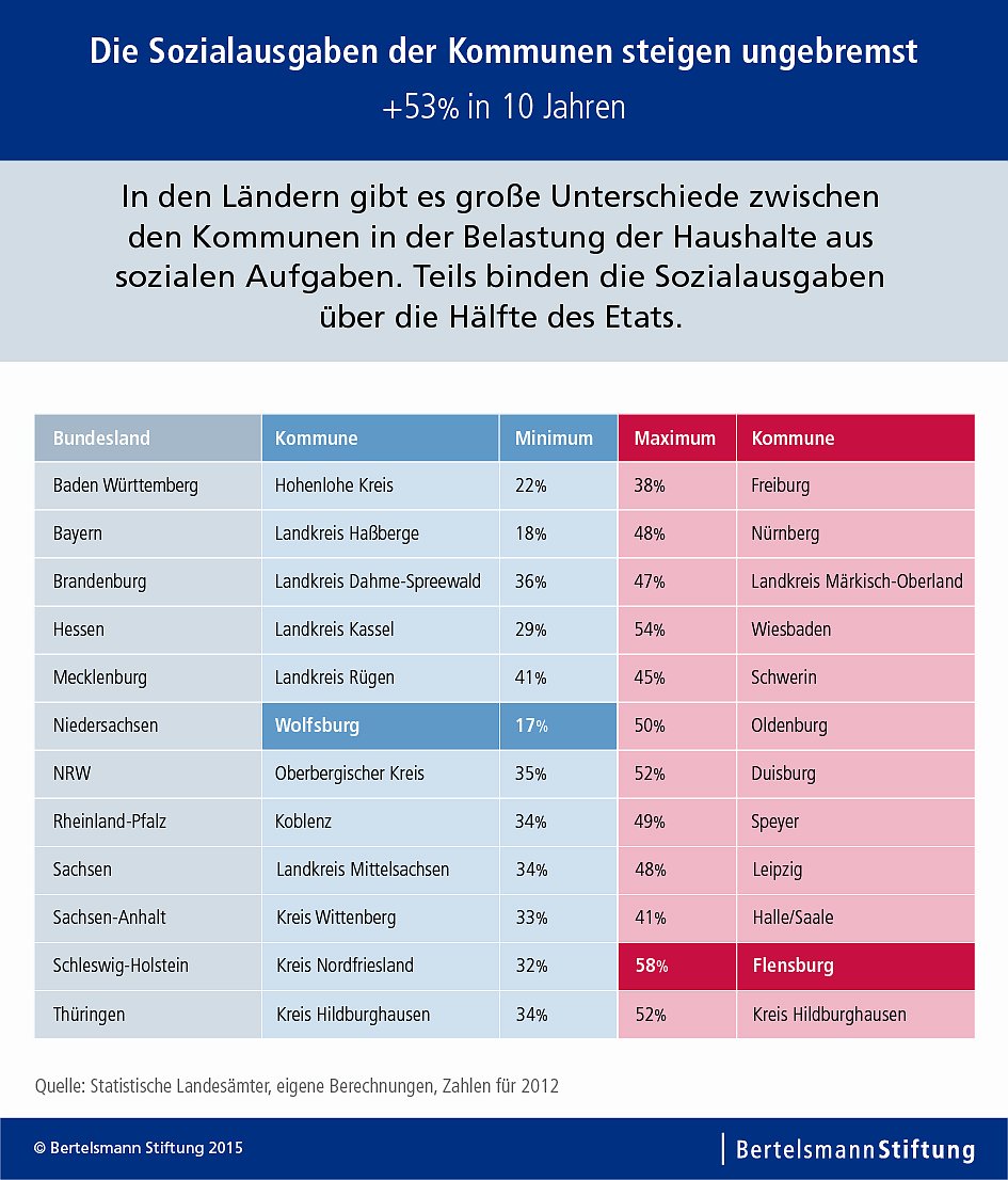 Zwischen den einzelnen Kommunen sind die Unterschiede teilweise eklatant: Während die Stadt Wolfsburg (17 Prozent) und der bayerische Kreis Haßberge (18 Prozent) nur einen kleinen Teil ihres Etats für Sozialleistungen aufwenden, machen die Sozialkosten in Duisburg, Wiesbaden, Eisenach und Flensburg mehr als die Hälfte des städtischen Haushalts aus.