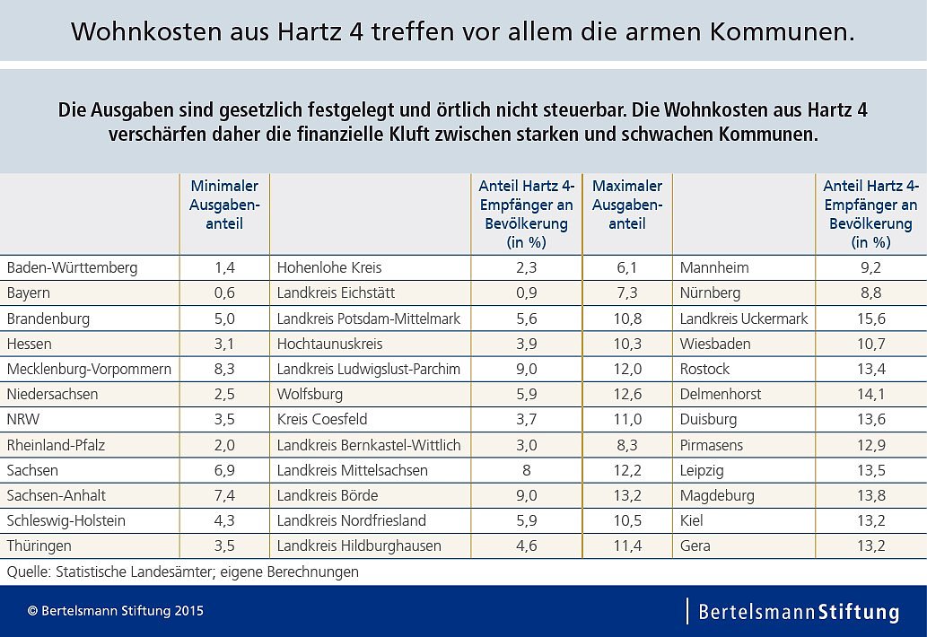 Vor allem wirtschaftsschwache Kommunen mit hoher Langzeitarbeitslosigkeit und geringen Steuereinnahmen ächzen unter den hohen Ausgaben für diese Wohnkosten. Sie beliefen sich 2013 bundesweit auf rund 14 Milliarden Euro. Im wirtschaftsstarken Baden-Württemberg binden sie lediglich 3 Prozent der kommunalen Etats, im strukturschwachen Sachsen-Anhalt hingegen 11 Prozent. Die Belastung der Stadt Magdeburg etwa ist fast zehn Mal höher als jene im baden-württembergischen Kreis Hohenlohe (13,2 zu 1,4 Prozent).Eine Übernahme der Wohnkosten für Hartz-4-Empfänger ist der entscheidende Hebel für den Bund, den armen Kommunen gezielt zu helfen, sagte René Geißler, einer der Autoren der Studie und Finanzexperte der Bertelsmann Stiftung. Etliche große Ausgabeposten in den kommunalen Sozialetats scheiden hingegen aus, weil die Kommunen große eigene Gestaltungsspielräume haben. Das ist zum Beispiel in der Jugendhilfe oder Sozialhilfe der Fall.