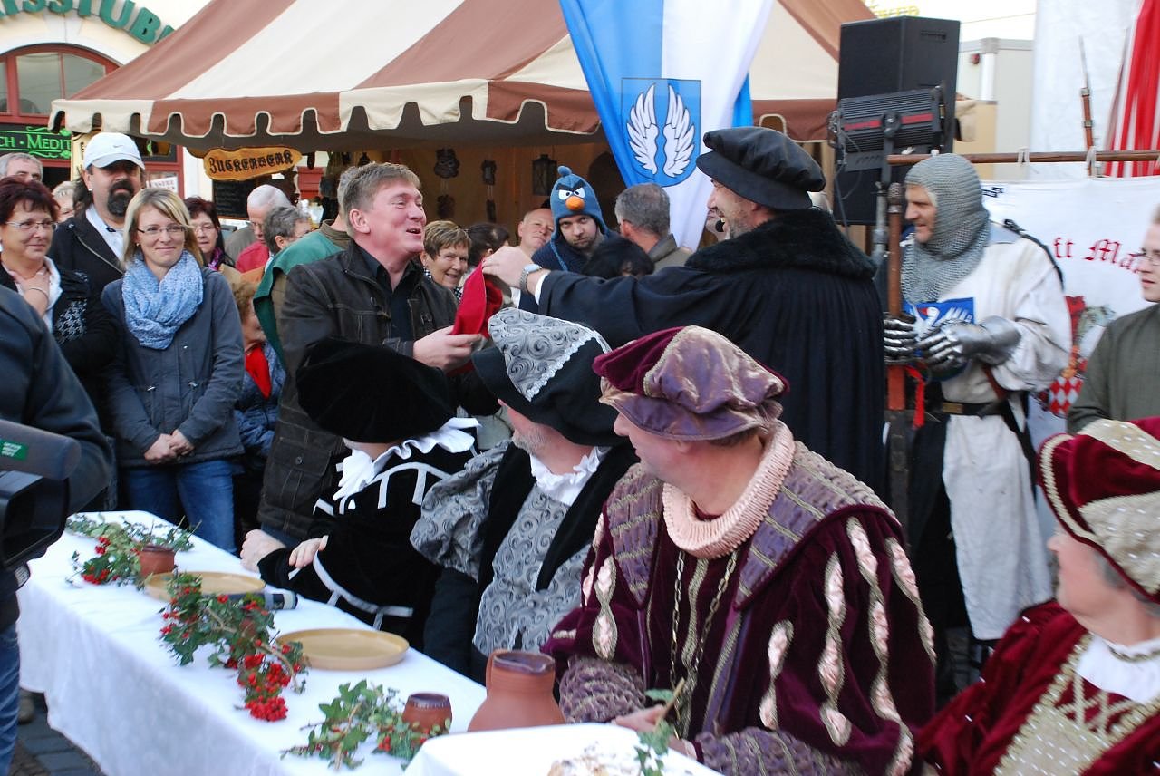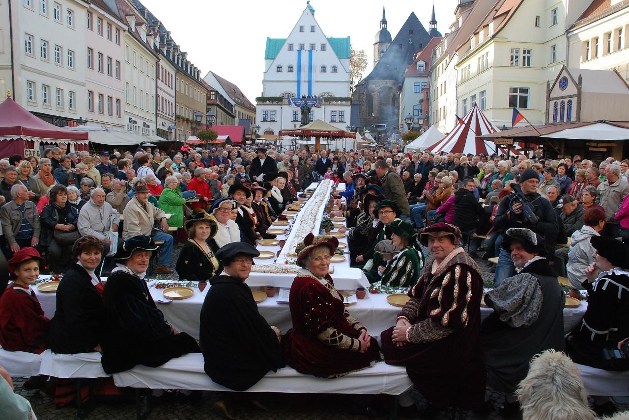 Das kommt so oft auch nicht vor, dass derjenige, der am gedeckten Tisch sitzt, später hungrig nach Hause geht. Auf Luthers Geburtstagsfeier heute Nachmittag erging es Eislebens Oberbürgermeisterin Jutta Fischer so. Sie saß an der weiß gedeckten Tafel auf dem Marktplatz vor einem sage und schreibe elf Meter langen Stück Kuchen, packte sich davor reichlich auf den Teller, stand auf und ging. Nicht nach Hause, nein, sie ging zu den Menschen, die den langen Tisch umringten und bot den fröhlich Zulangenden die Stolle an. Das wiederholte sie mehrmals. Andere am Tisch folgten ihrem Beispiel und verteilten die Vorweihnachtsköstlichkeit an die dankbaren Geburtstagsgäste. Ihnen wird es ähnlich ergangen sein wie Frau Fischer: Als sie sich endlich selbst Zeit für ein Stück Stolle nehmen wollten, war sie alle. Landtagsabgeordneter Norbert Born (SPD), der vor dem Essen von Moderator Dirk Fuhlert im Publikum entdeckt und dann genötigt worden war, mit an der Tafel Platz zu nehmen (der Optik wegen musste er eine Mütze aufsetzen - passend zu seiner Partei bekam er eine rote), verteilte ebenfalls Stolle, doch er fand am Ende wenigstens noch ein paar Rosinen auf seinem Teller, die er zum Gaudi der Umstehenden wegnaschte.Spaß war groß geschrieben an diesem Wochenende. Ein Mittelalter-Spektakel mit viel historischem Handwerk, Luthers Biernacht, eine Feuershow, zwei Umzüge, ein Treffen von Menschen mit dem Namen Luther, offene Geschäfte, ungezählte kleine und große Vorführungen auf Bühne und Markt und natürlich die Stolle aus dem Hause Morgenstern lockten zwei Tage lang tausende Menschen in die Eisleber Innenstadt.