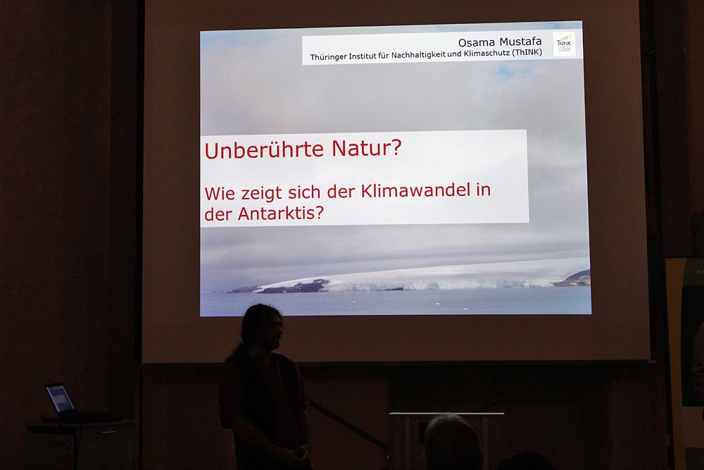 Osama Mustafa vom Thüringer Institut für Nachhaltigkeit und Klimaschutz verbrachte bereits sechs mehrmonatige Forschungsaufenthalte auf dem Südkontinent. Er berichtete über seine Arbeit mit Pinguinen und darüber welchen Einfluss der Klimawandel auf diesen scheinbar vom Menschen so unberührten Teil der Welt hat. An Osama Mustafa und seinem Vortrag lag es nicht, denn der hätte einen wesentlich besseren Besuch verdient.