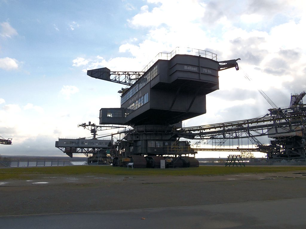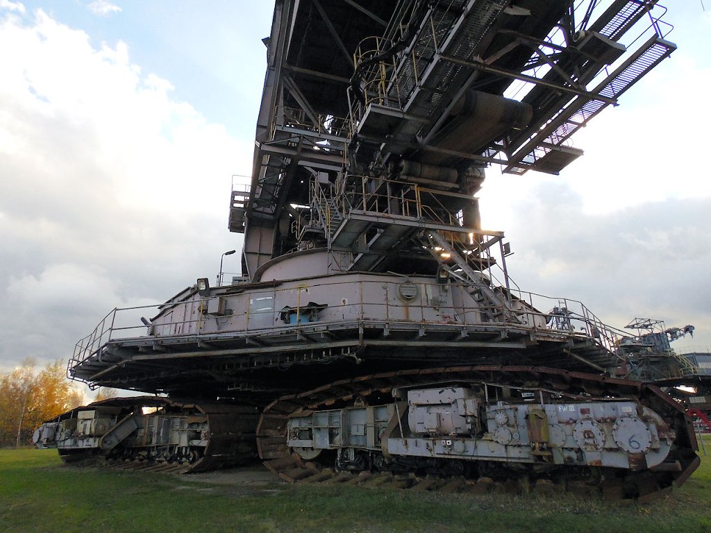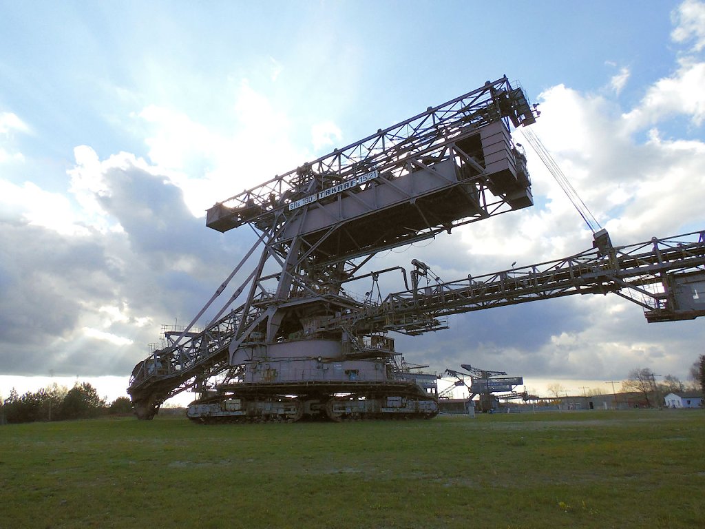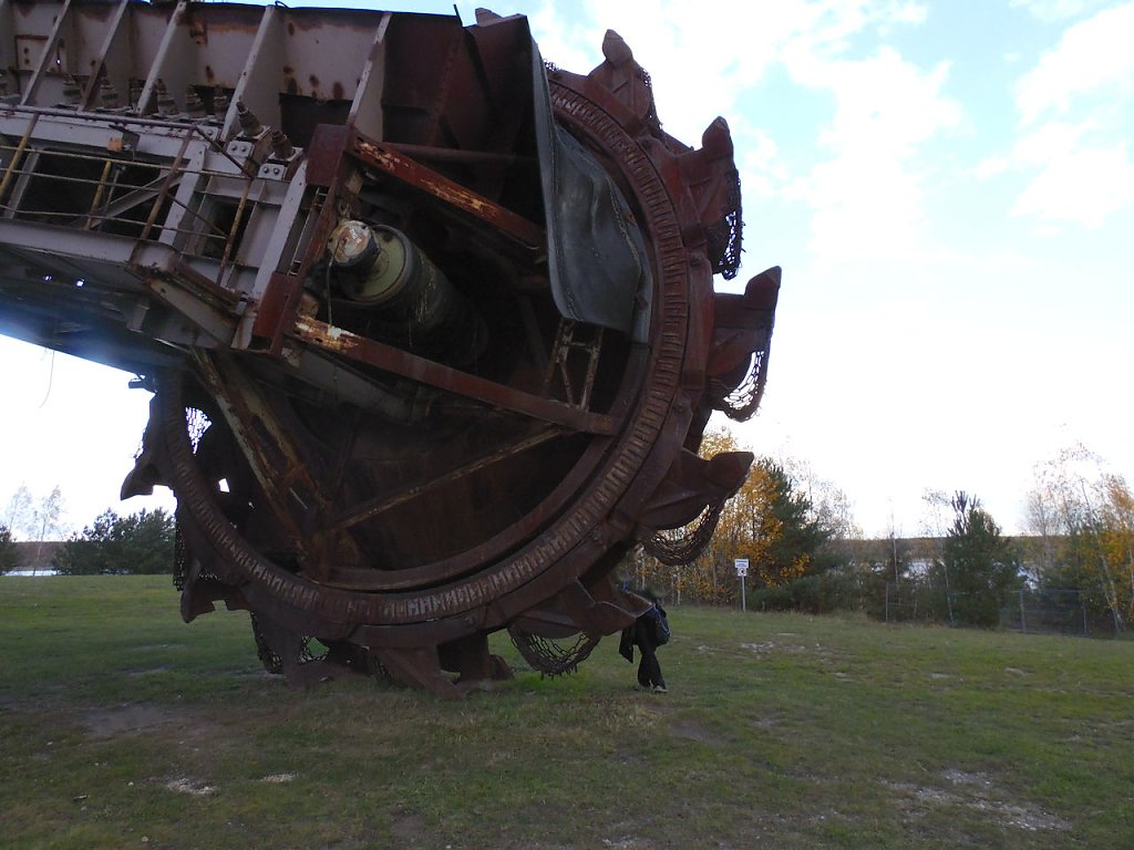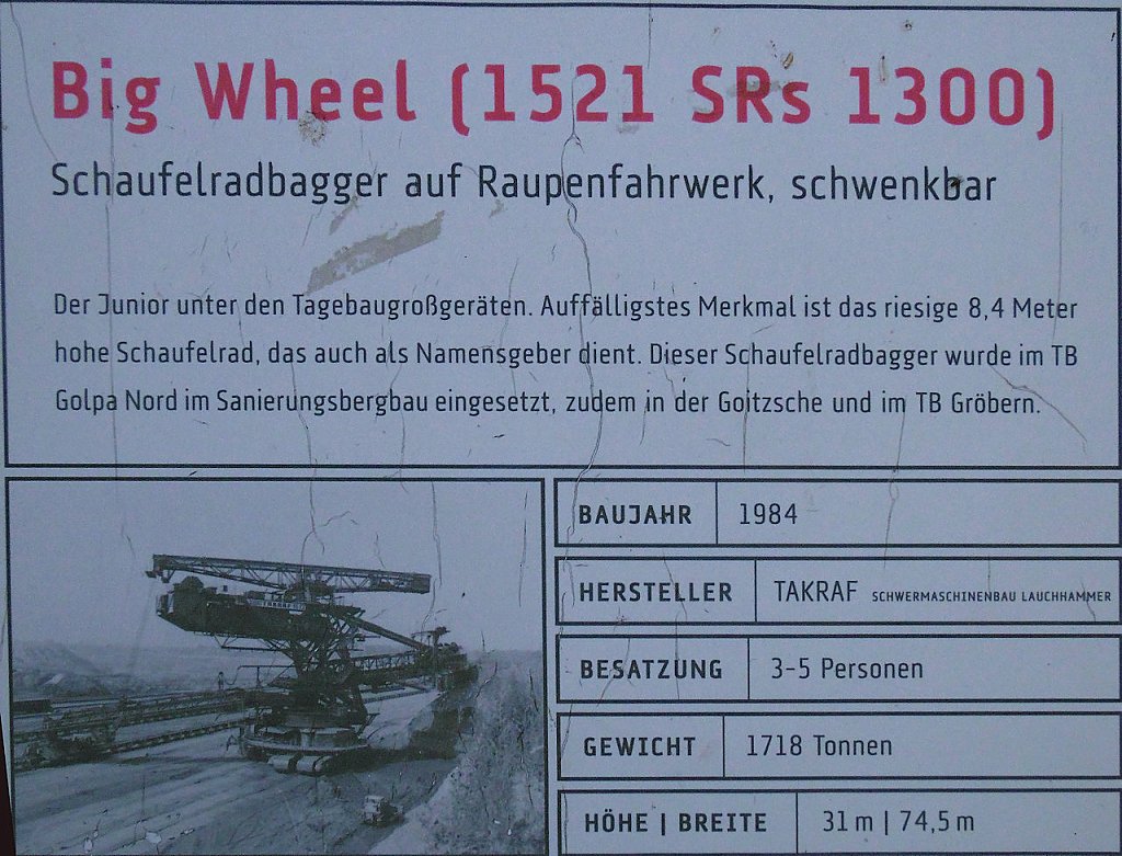 Einer der jüngsten Bagger, die hier stehen ist der "Big Wheel". Der Schaufelradbagger wurde 1984 von der Firma TAKRAF gebaut, er hat ein stolzes Gewicht von 1718 Tonnen, die Höhe beträgt 31 Meter. Drei bis fünf Personen waren nötig, um dieses 74,5 Meter breite Ungetüm zu steuern.