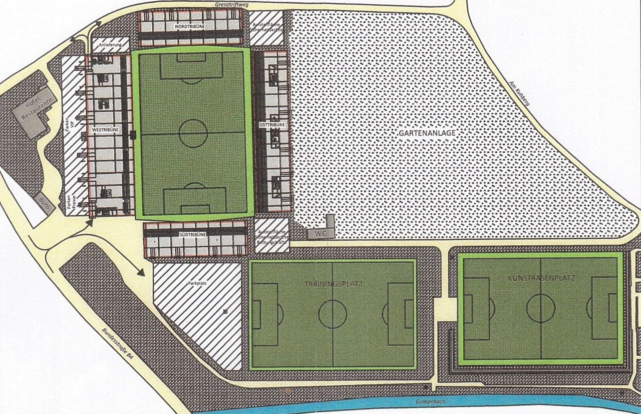 Dafür muss der jetzige Trainingsplatz zwischen Geschäftsstelle und Sitzplatztribüne weichen, dort wird die große, mit 374 Sitzplätzen ausgestattete West- oder Haupttribüne hingebaut. (siehe Grafik).