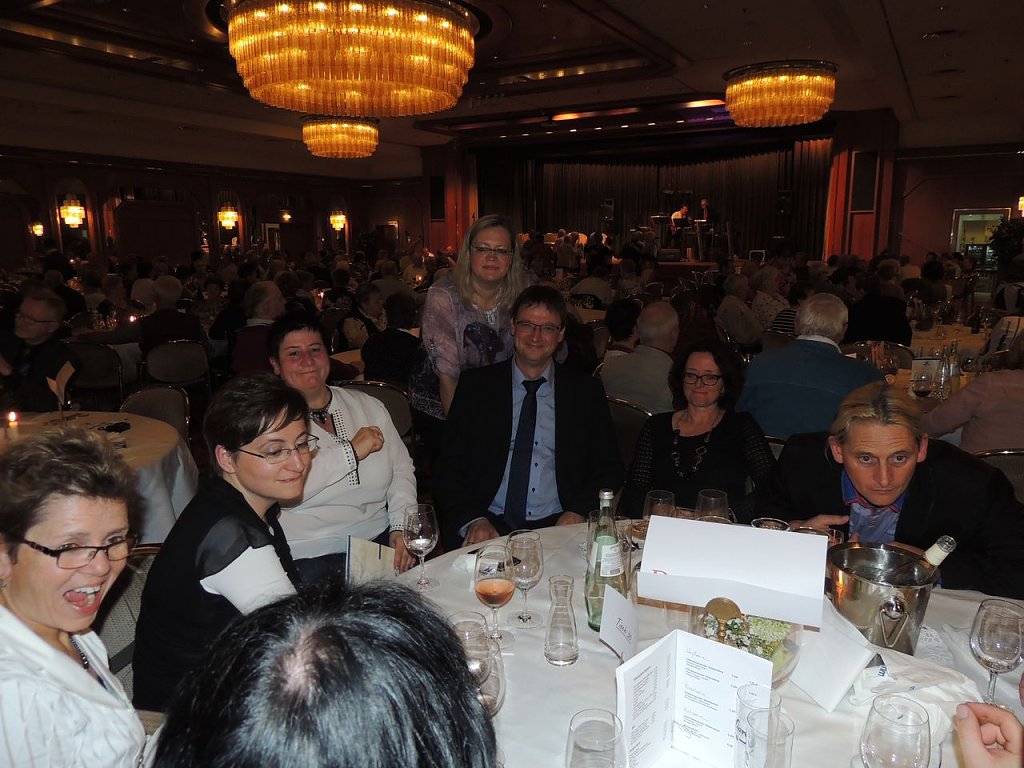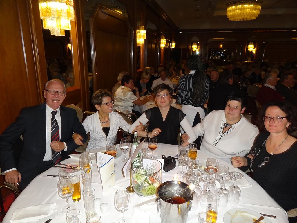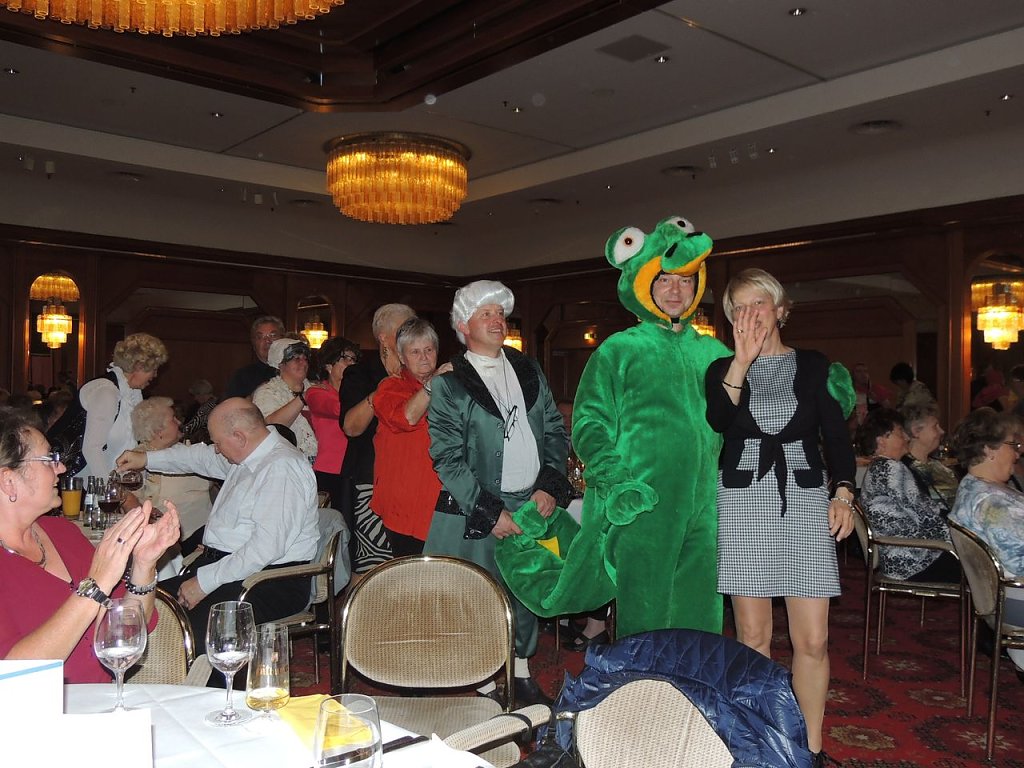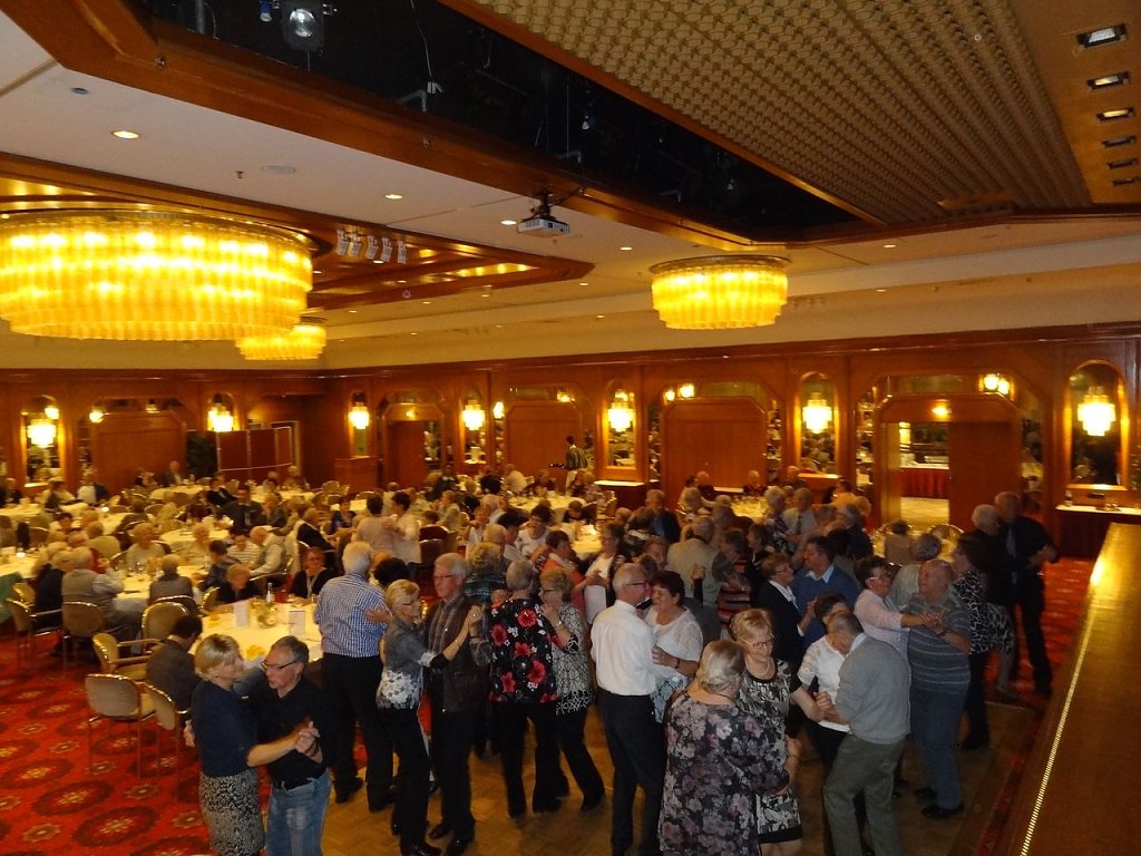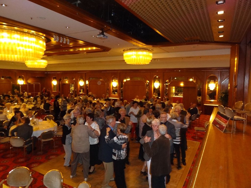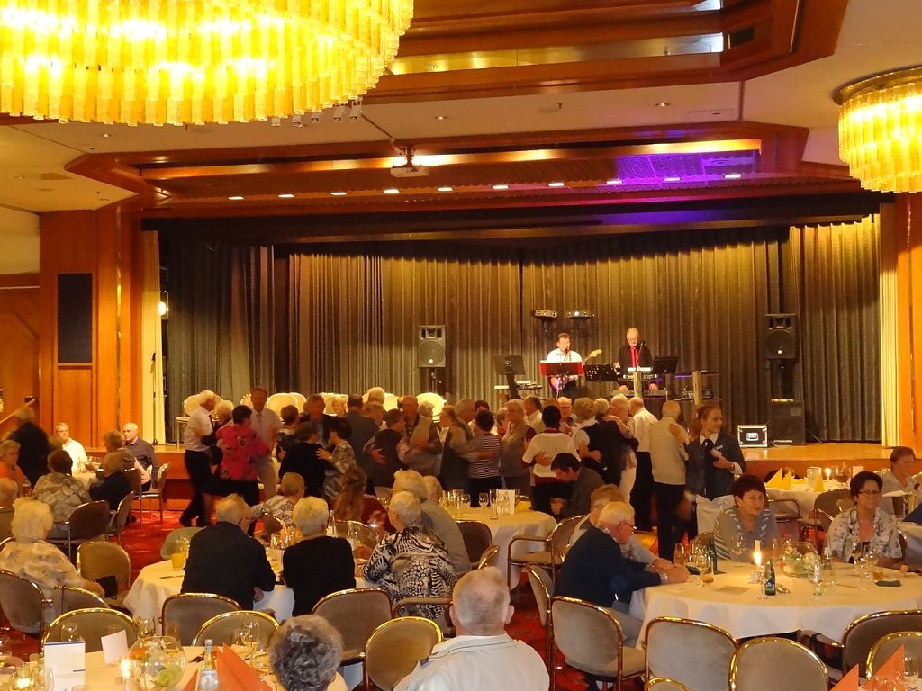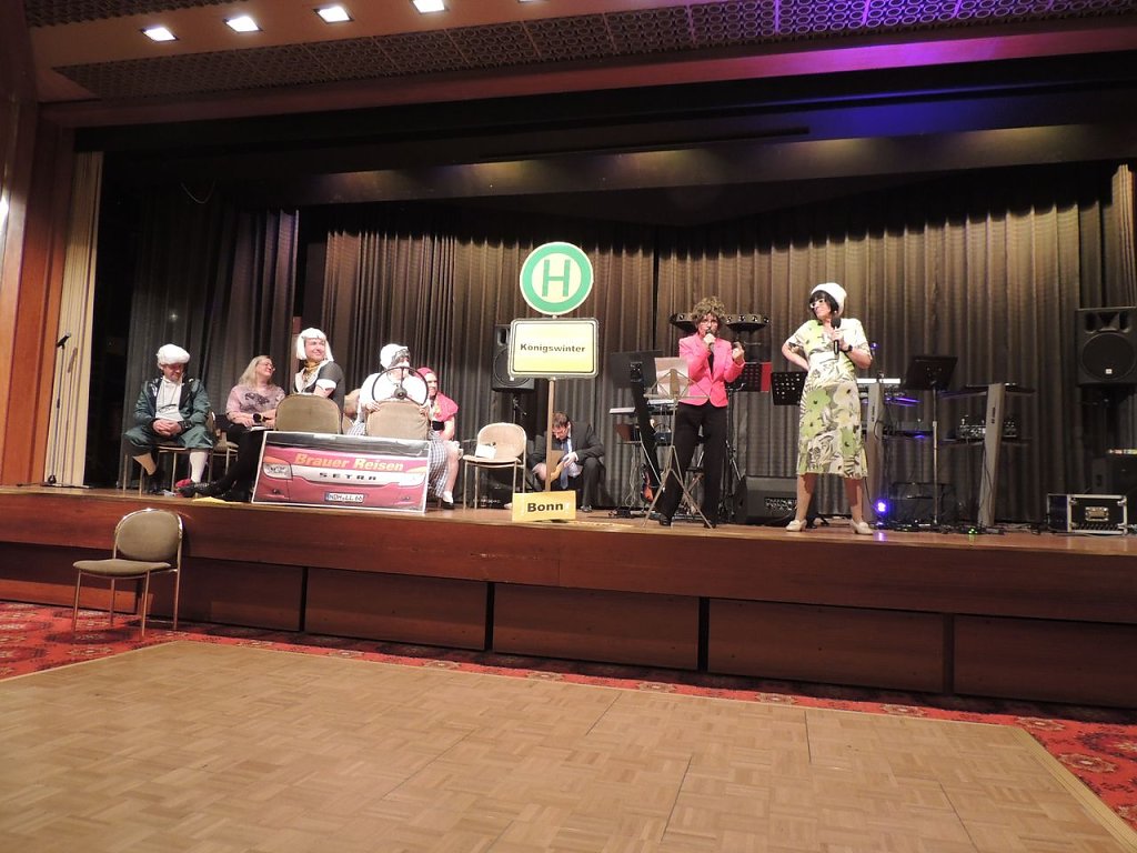 Anschließend ging es entlang des Rheins nach Königswinter. Im Hotel Maritim direkt am Ufer des Flusses wurde die Gruppe herzlich empfangen. Zum Abendessen im großen Festsaal war ein köstliches Buffet vorbereitet. Für die Musik an beiden Abenden waren eigens Musiker aus Thüringen mit angereist. Doch nicht nur tanzen wollten die Gäste, es wurde auch gespannt darauf gewartet, welches kleine Programm sich die Reiseleiterinnen und Busfahrer wieder ausgedacht haben. Es wurde eine lustige Busfahrt mit illustren Fahrgästen auf die Bühne gebracht, die Lachmuskeln hatten gut zu tun. Anschließend wurde noch ausgiebig die Gelegenheit zum Tanzen genutzt.