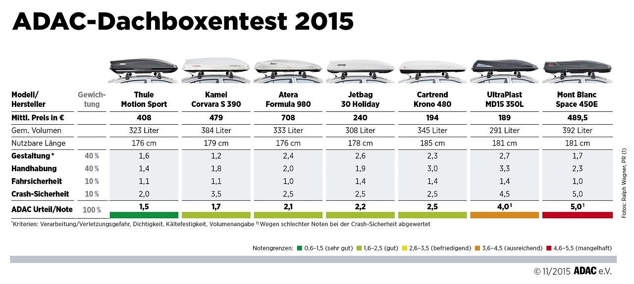Von sehr gut bis mangelhaft – beim aktuellen ADAC-Vergleichstest von sieben Dachboxen sind fast alle Noten vertreten. Sieger der Untersuchung ist die Dachbox Motion Sport von Thule. Die hochwertige und kompakte Box leistete sich kaum Schwächen und erhielt daher die Note sehr gut...