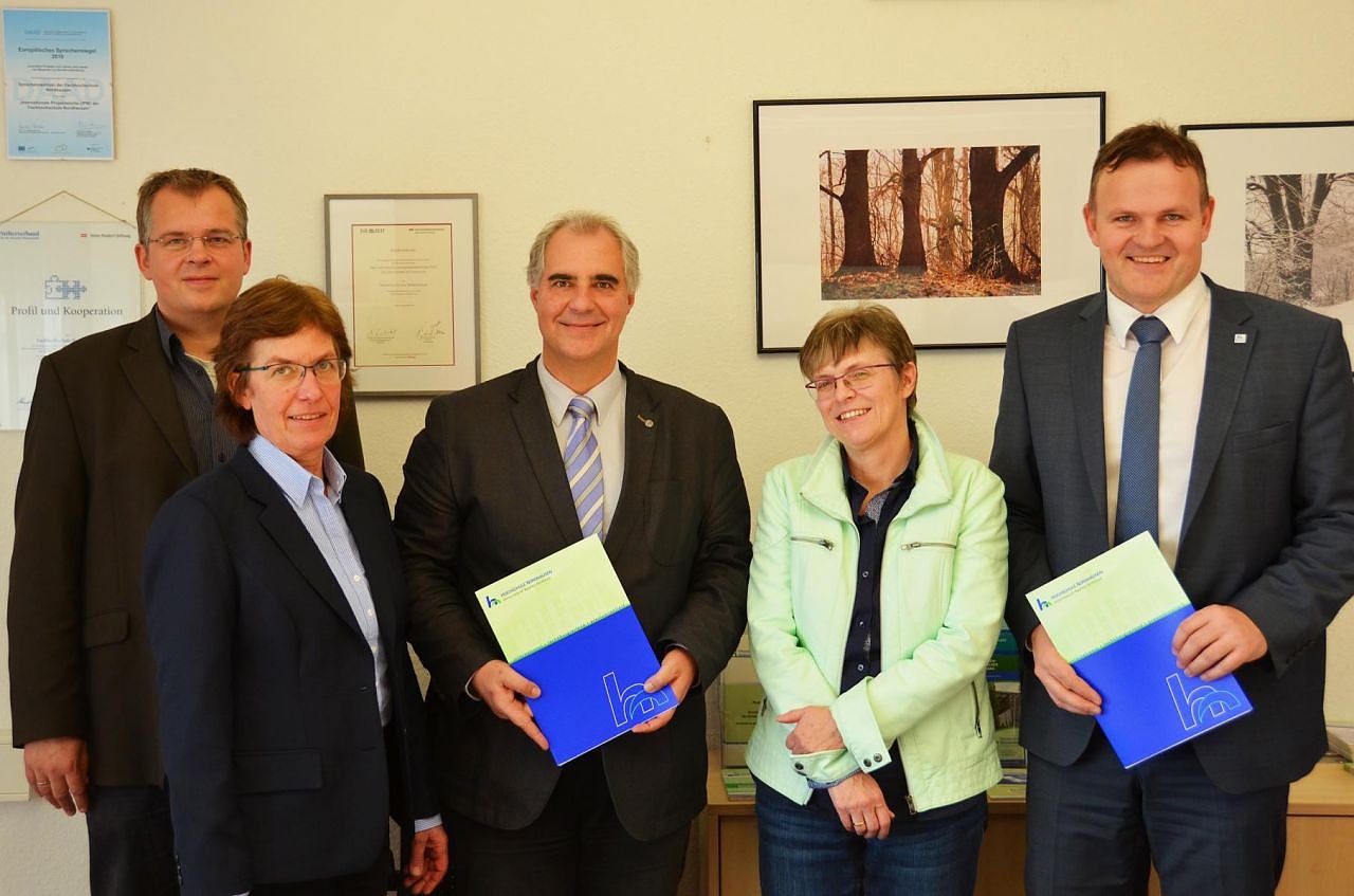Von links: Dr. Rainer Hartmann, Anmagret Lohse und Jörg Leppin von der Elly-Heuss-Knapp- Schule sowie Prof. Dr. rer. nat. Uta Breuer und Prof. Dr. Jörg Wagner von der Hochschule NordhausenDie Kooperation zwischen Schulen und Hochschulen im Bereich der Ingenieurwissenschaften, gerade vor den Aufgaben der sich verschärfenden Umweltproblematik, soll intensiviert werden. Aus diesem Grund wollen die Hochschule Nordhausen und die Elly-Heuss-Knapp- Schule in Neumünster künftig eng zusammenarbeiten.