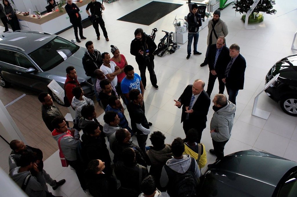 Herzlich willkommen in der Autowelt-Peter, Ihrem möglichen künftigen Arbeistplatz! – mit diesen Worten begrüßte Helmut Peter, Geschäftsführer der gleichnamigen Autohaus-Gruppe, heute 30 junge Männer und eine Frau aus Syrien und Eritrea in der Skoda-Autowelt.