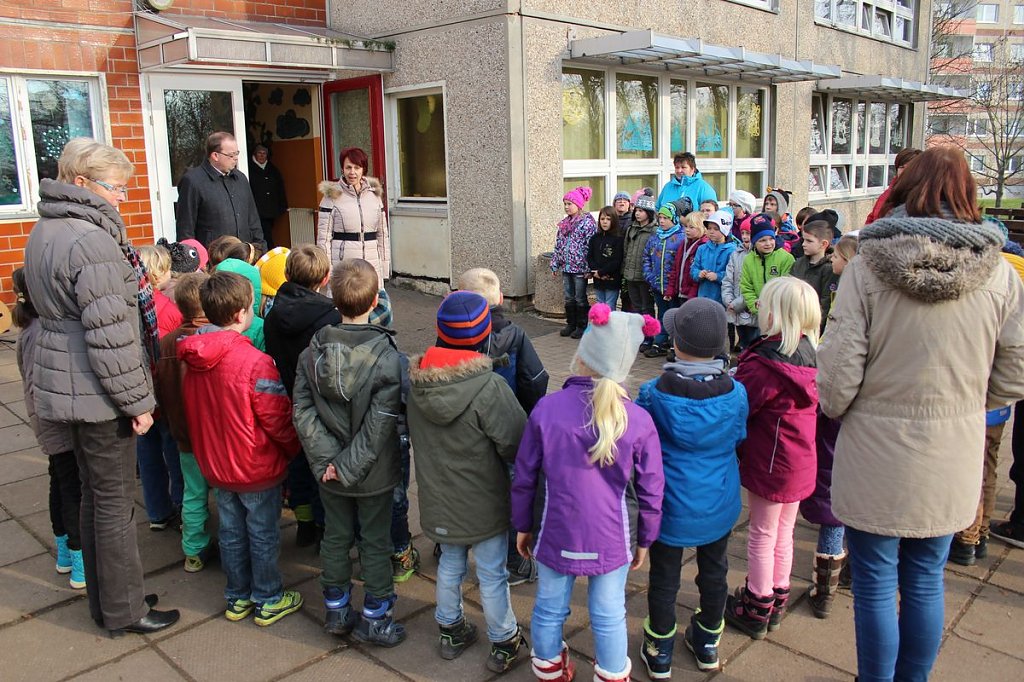 Schulleiterin Angela Schröter und Bad Frankenhausens Bürgermeister Matthias Strjec (SPD) waren dabei, als Michael Scheffler mit einer Überraschung aufwartete. Jedes Kind der ersten Klasse (und später auch die der teilgenommenen Kindergartenkinder) erhält einen Plüsch-Elch.