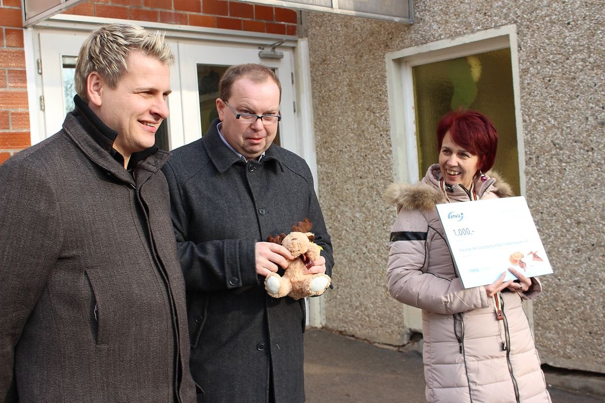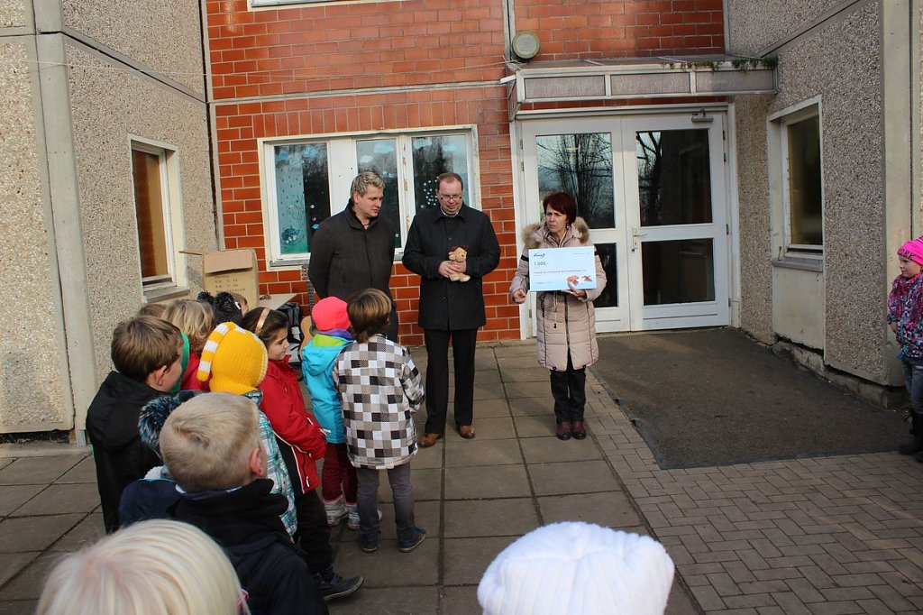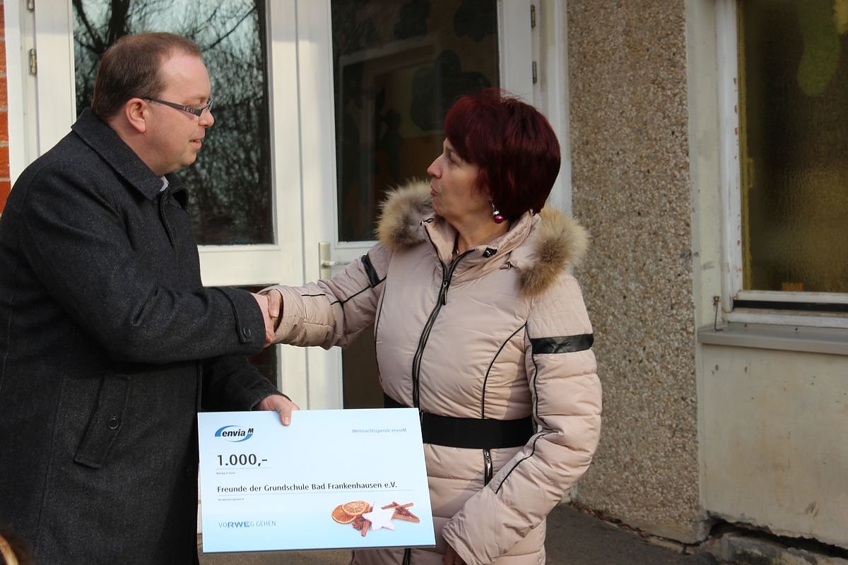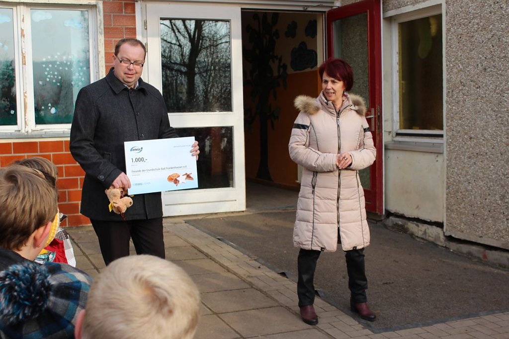 Und so richtig mit Schauspielern kostet eine Veranstaltung Geld. Und heute brachte der Kommunalbetreuer des Energieunternehmens enviaM Michael Scheffler einen symbolischen Scheck in Höhe von 1.000 Euro für den Förderverein vorbei, und so mussten die Eltern damals für die Theateraufführung nichts zu zahlen.