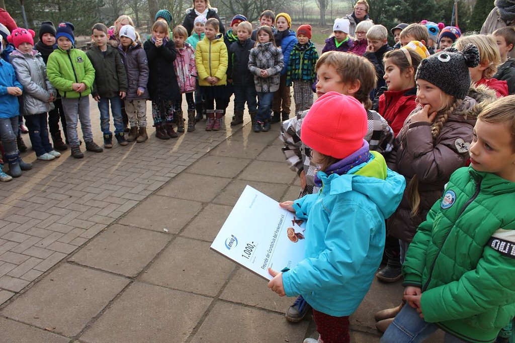 Die Schüler überraschten den Gast, den als Angela Schröter die Nullen auf dem Scheck abdeckte und nach und nach freigab, kannte man die Zahlen schon, von 1 über 10 bis zur 100 und dann der 1.000, denn der Scheck hatte einen Wert von 1.000 Euro.