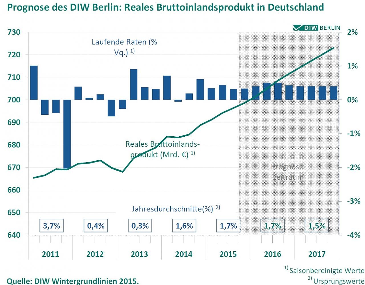 Die deutsche Wirtschaft wird ihren Aufwärtstrend voraussichtlich auch in den kommenden beiden Jahren fortsetzen: Der neuesten Konjunkturprognose des Deutschen Instituts für Wirtschaftsforschung (DIW Berlin) zufolge dürfte das Bruttoinlandsprodukt nach einem Anstieg um 1,7 Prozent in diesem Jahr auch im kommenden Jahr um diesen Wert wachsen...