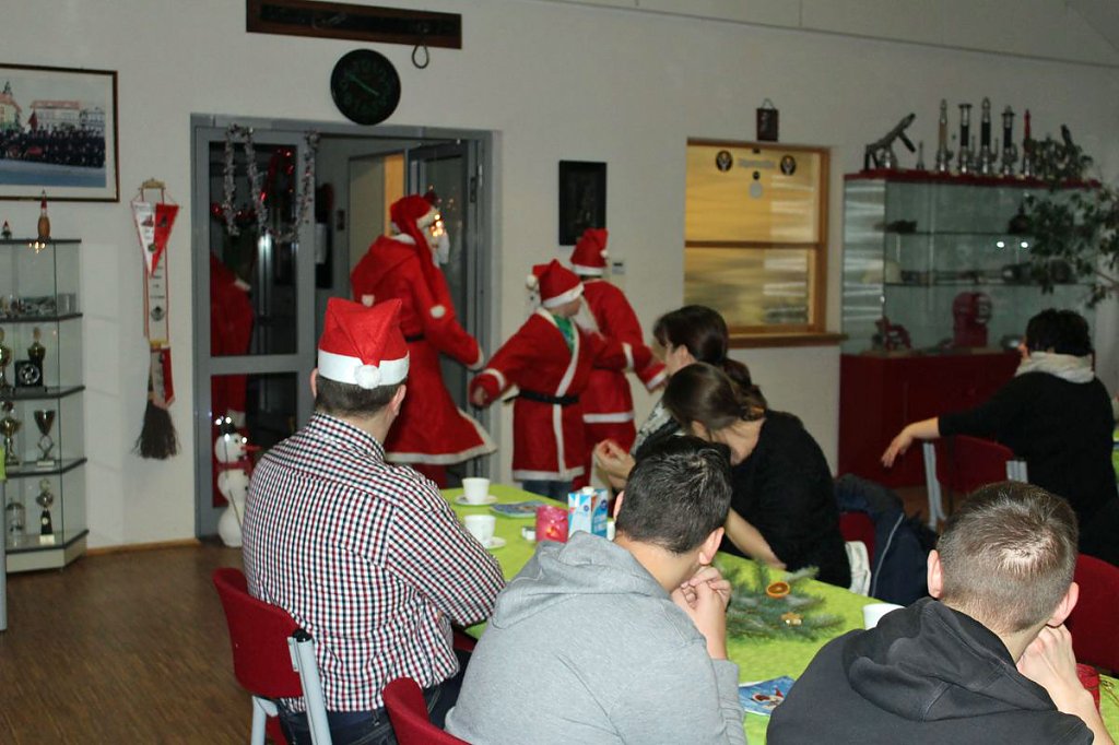 Muttis und Vatis, aber auch Unterstützer der Feuerwehr, besonders der Jugendfeuerwehr, waren zu dieser Weihnachtsparty eingeladen. Aber was war das? Da kamen ja noch mehr Weihnachtsmänner und sogar Weihnachtsengel mit. Die führten ja einen richtigen Tanz auf, der mit viel Beifall quittiert wurde.