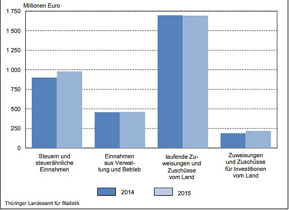 Die Thüringer Gemeinden, Verwaltungsgemeinschaften und Landratsämter hatten in den ersten neun Monaten 2015 Ausgaben in Höhe von 3,57 Milliarden Euro. Das waren nach Mitteilung des Thüringer Landesamtes für Statistik 52,5 Millionen Euro bzw. 1,5 Prozent mehr als im vergleichbaren Vorjahreszeitraum.