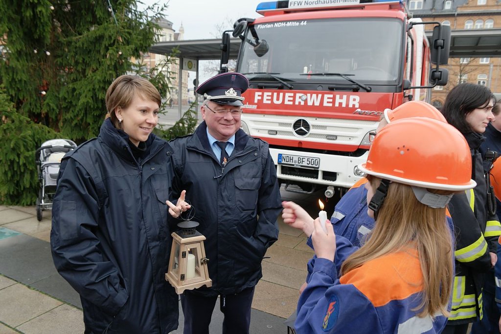 In den Vorjahren wurde das Friedenslicht aus Bethlehem, das alljährlich in der Geburtsgrotte Jesu Christi entzündet wird, in diesem Jahr nicht mit dem Zug nach Nordhausen gebracht, sondern die Floriansjünger Marcel Unger, Kevin Höhnel und Enrico Gothe aus der Jugendfeuerwehr Nordhausen-Mitte hatten das Licht zusammen mit der Kreis-Jugendfeuerwehrwartin Manja Bernsdorf am 3. Advent vom landesweiten Aussendegottesdienst in Leinefelde abgeholt.