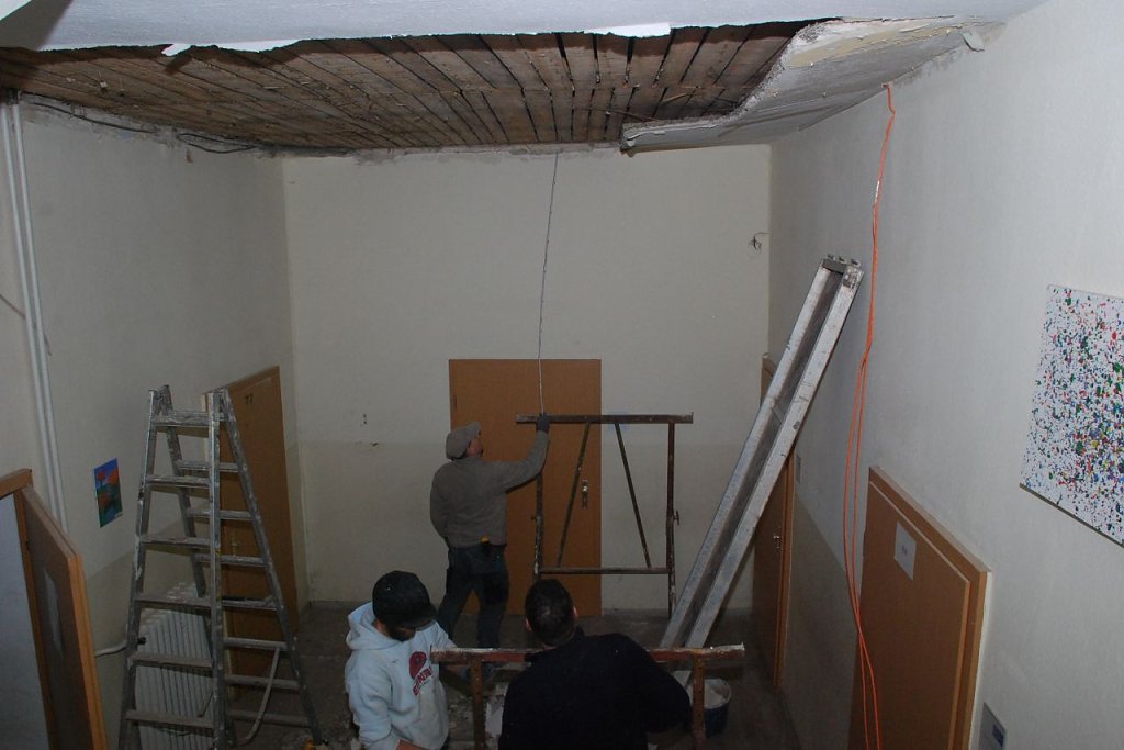 Alles andere als eine nette Weihnachtsüberraschung erwartete die Schüler des Alexander und Wilhelm von Humboldt Gymnasiums Hettstedt am letzten Schultag vor den Weihnachtsferien im Haus III ihrer Schule: Deckenputz. Allerdings nicht dort, wo er hingehörte, an der Decke des Flures – das wäre ja keine Überraschung gewesen –, sondern am Boden. Der Putz war offenbar in der Nacht herabgefallen.Lehrer und Schüler fanden morgens auf dem Weg nach oben den Fußboden der ersten Etage des Hauses III mit zentimeterhohem Putz übersät vor. Beim Blick zur Decke zeigte sich ihnen eine Bretterverkleidung; hier waren die nun unten liegenden Sauerkrautplatten vor vielleicht 40 Jahren einmal angenagelt worden. Offenbar hatten die Nägel keine oder keine ausreichend großen Köpfe bzw. Unterlegscheiben besessen; sie hätten das Herausrutschen der Platten verhindert. Sauerkrautplatten werden magnesit- oder zementgebundene Holzwolleleichtbauplatten genannt, welche an Beton oder Holz befestigt und meistens mit einer Sand-Kalk-Zement-Putzschicht überzogen wurden. Solche Platten sind bauphysikalisch unbedenklich, da sie diffusionsoffen und kapillar aktiv sind. Bedenklich sind sie erst, wenn sie herunterfallen. Wie nun in Hettstedt.