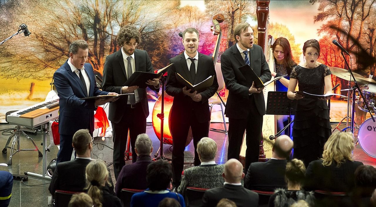 v.l.n.r. Die Künstler des musikalischen Weihnachtsabends in der Sparkasse: Clemens Tiburtius, Bob Minette, Stefan Rauschelbach, Tillmann Steinhöfel, Daiva Schumann an der Harfe und Nadine Zicke.