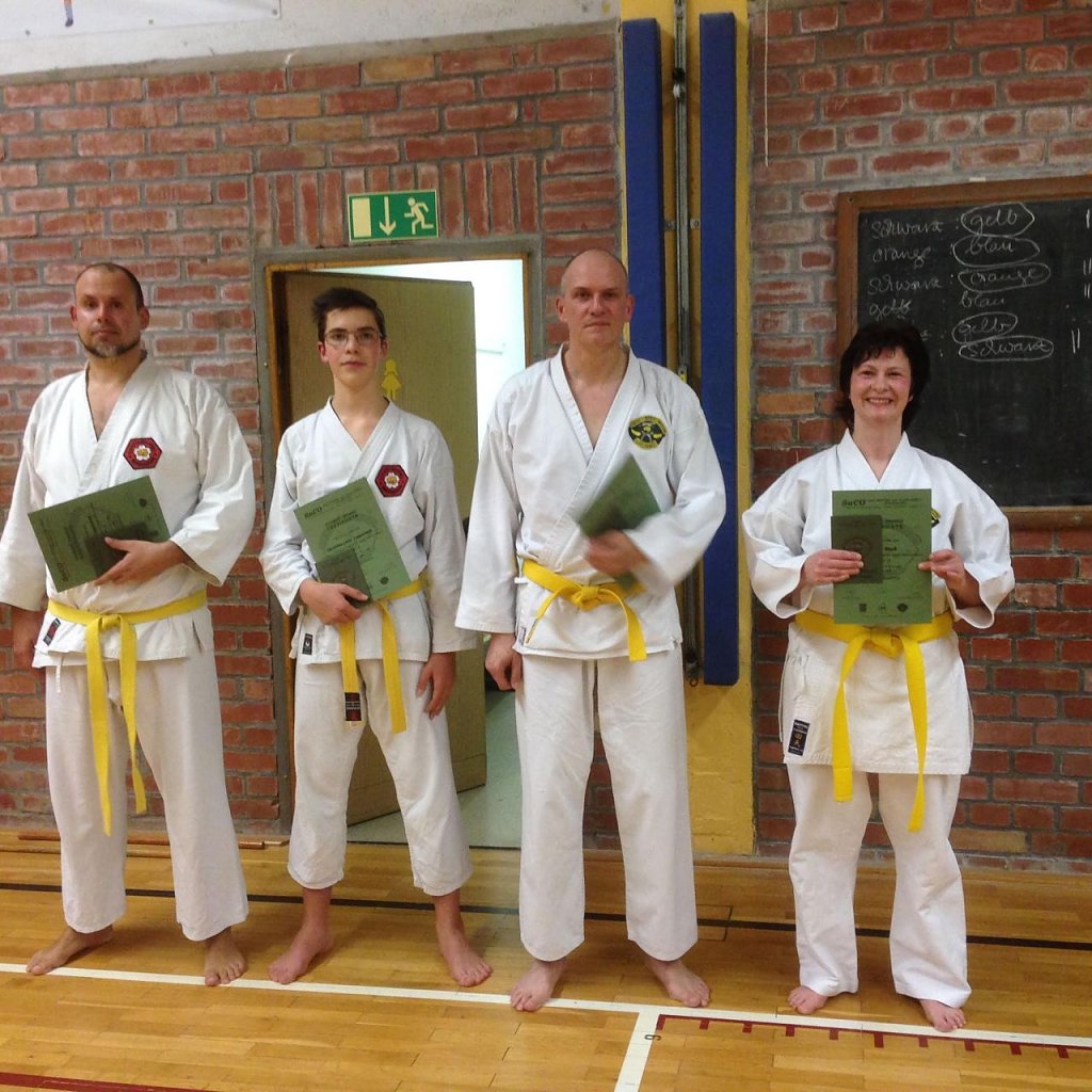 Mit Punktgleichstand wurden diesmal Arnim Lepperhoff und Konstantin Probst die Dritten im Bunde. Sie bekamen als Prämie jeweils ein Karatebuch. Im Anschluss an die Trainingseinheiten wurde es aber noch einmal richtig ernst. Wer zugelassen war, durfte sich der Prüfung zum nächsthöheren Schülergrad in Shotokan-Karate stellen. Unter den kritischen Augen des Prüfers konnten 24 Karateka ihr Prüfungsprogramm überzeugend darbringen und am Ende sich völlig verdient einen neuen Gürtel mit einer dunkleren Gürtelfarbe umbinden.