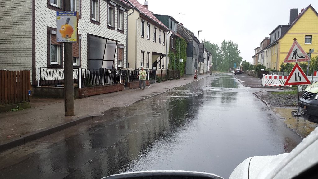 Da die Autofahrer selten langsam fahren, schießt die Wasserwelle – man glaubt es kaum – bis unter die Fenster in der 1. Etage! Und da hier in der Straße nur ein kleiner Abfluss im Jahr 2014 wieder geschaffen wurde, bleibt das Wasser einige Stunde so stehen. Zudem wurden 2015 einige Anwohner aufgefordert, ihre Dachentwässerung auf das Grundstück zu führen, wodurch auch eine Entlastung kam. Der Graben im Friedhofsweg wurde 2015 ausgebaggert und - wie Sie schon erfahren haben - soll eine weitere Entwässerung stattfinden.