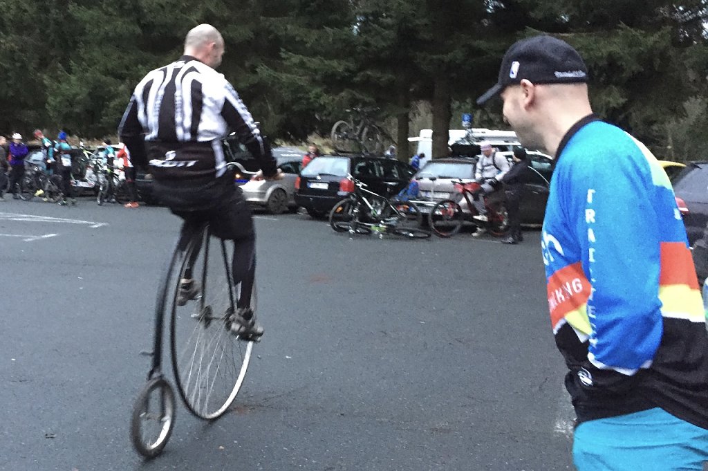 Von ganz jung bis relativ alt, vom Hochrad bis zum Fatbike, fast jede Fraktion war vertreten. Mit dem Hochrad ist dann allerdings doch niemand hochgefahren, es war eher die Attraktion auf dem Parkplatz.