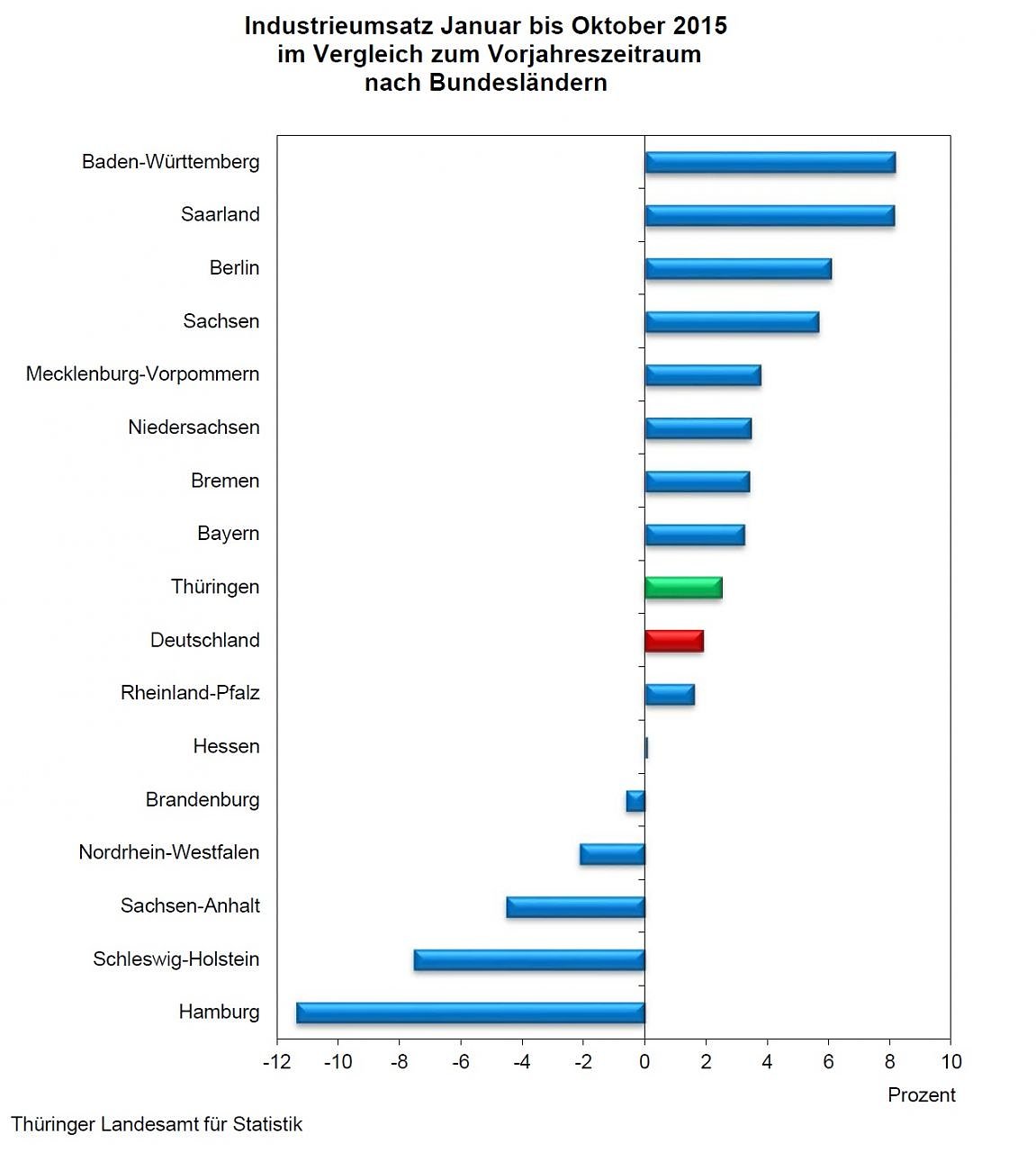 Der Umsatz der Thüringer Industriebetriebe mit 50 und mehr Beschäftigen stieg von Januar bis Oktober 2015 (bei einem Arbeitstag mehr) um 2,5 Prozent gegenüber dem vergleichbaren Vorjahreszeitraum. In der Summe der neuen Bundesländer und in Deutschland wurde ein Anstieg um 2,1 Prozent bzw. 1,9 Prozent ermittelt...