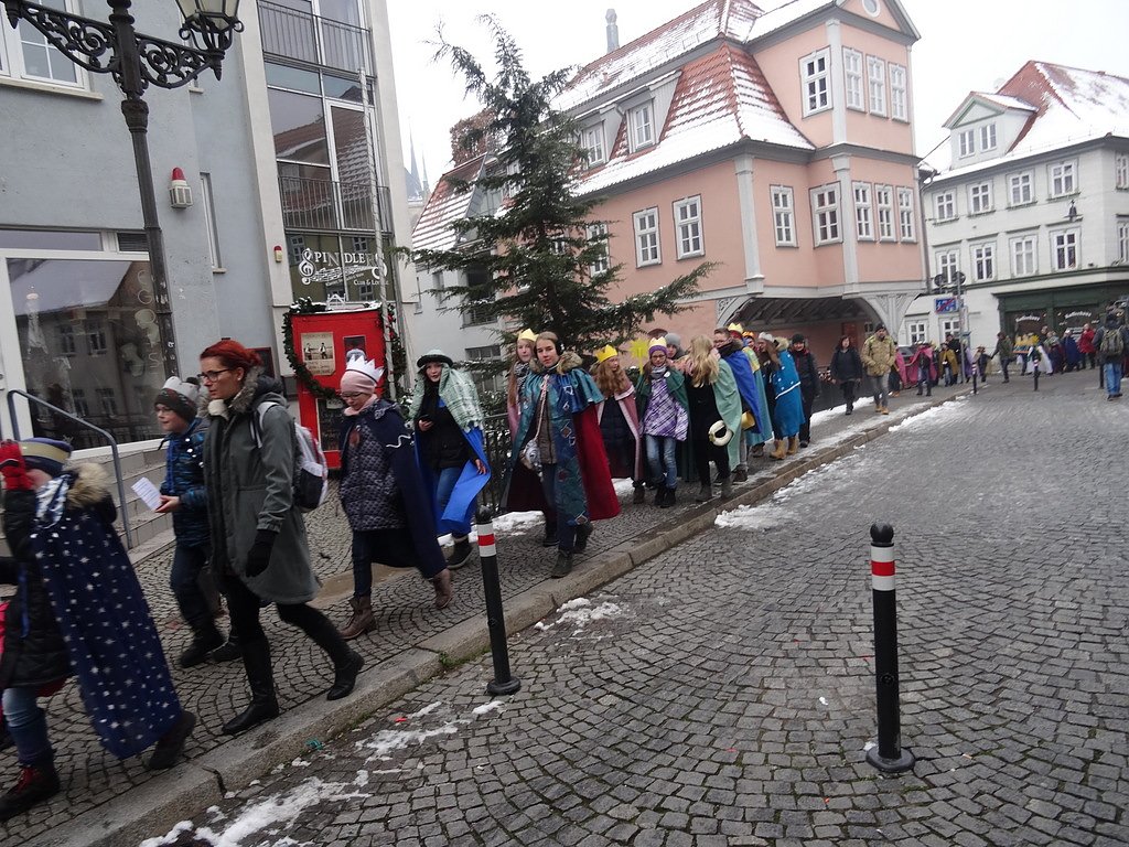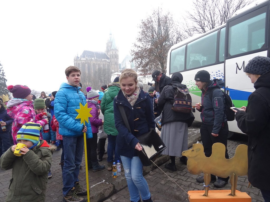 Die Busse konnten auf dem Domplatz halten. Hier gab es für alle die erste Stärkung, eichsfelder Wurst mit Brötchen und genug Getränke. So gestärkt übernahmen die Mädchen und Jungen wieder ihre Rollen als Kaspar, Melchior und Balthasar, zogen ihre Gewänder an und setzten die Kronen auf. Die rund 120 Kinder und Erwachsenen setzten sich dann vom Domplatz in Richtung Staatskanzlei in Bewegung. Die Erfurter waren erstaunt über solch einen bunten Zug und einige fotografierten auch gleich.