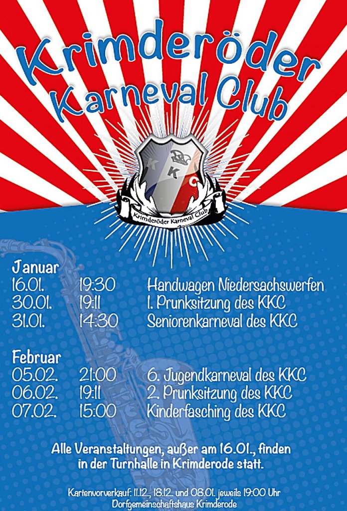 Die Vorbereitungen sind in vollem Gange und die Gäste können sich auf ein buntes Programm freuen. Der Vorverkauf für die anstehenden Hauptveranstaltungen findet jeweils am 08. und am 15. Januar 2016 um 19:00 Uhr im Dorfgemeinschaftshaus in Krimderode statt. Also sichert euch eure Karten und taucht ein in die Welt des KKC.
