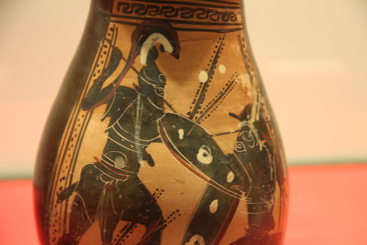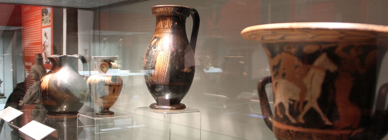 Die Ausstellungsstücke stammen von ihrer Alma Mater, der Schiller Universität zu Jena, die schon Mitte des 19. Jahrhunderts in den Genuss einer archäologischen Sammlung kam. Tausende Objekte beherbergt die Universität aber nur die schönsten finden ihren Weg in eine Vitrine, erklärte die angehende Archäologin. Häufig sind das Rot- und Schwarzfigurig bemalte Gefäße, die in vielen Fällen nie benutzt, sondern Verstorbenen mit ins Grab gegeben wurden. "Die Alltagsgegenstände waren oft unspektakulärer", erläutert Sänger, "wir holen ja auch nicht jeden Tag das gute Geschirr raus." Einige der Objekte stammen zum Beispiel aus den Schliemannschen Troja-Grabungen, die derart viel zu Tage gefördert haben, das Schliemann seine Funde auf die deutschen Museen verteilen konnte.
