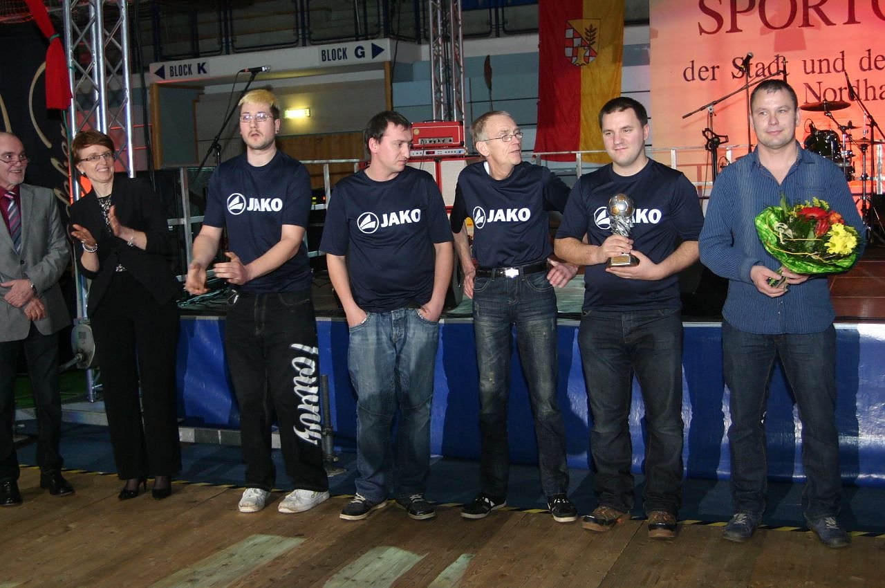 Erstmals musste ein Pokal für die Beste Mannschaft nachbestellt werden, denn es gab zwei erste Plätze. In der Addition der drei Wertungsblöcke – Vereine, Galagäste, Präsidium/Fachjury – gab es das gleiche Ergebnis und so wurden der Deutsche Meister, die Box-Staffel des Nordhäuser SV sowie Fußball-Regionalligaspitzenreiter Wacker Nordhausen gleichberechtigt zu Mannschaften des Jahres gekürt. Ungläubiges Staunen zunächst, dann aber natürlich große Freude bei den Radballern des SV Ilfeld. Das Duo Toni Fiebig/Toni Krause, Vizelandesmeister 2015, belegte überraschend den dritten Platz. Noch einmal präsentierten sich alle Geehrten dem Publikum, dann übernahm die Partyband AGELESS die Regie für die nächsten Stunden und bat zum Tanz.